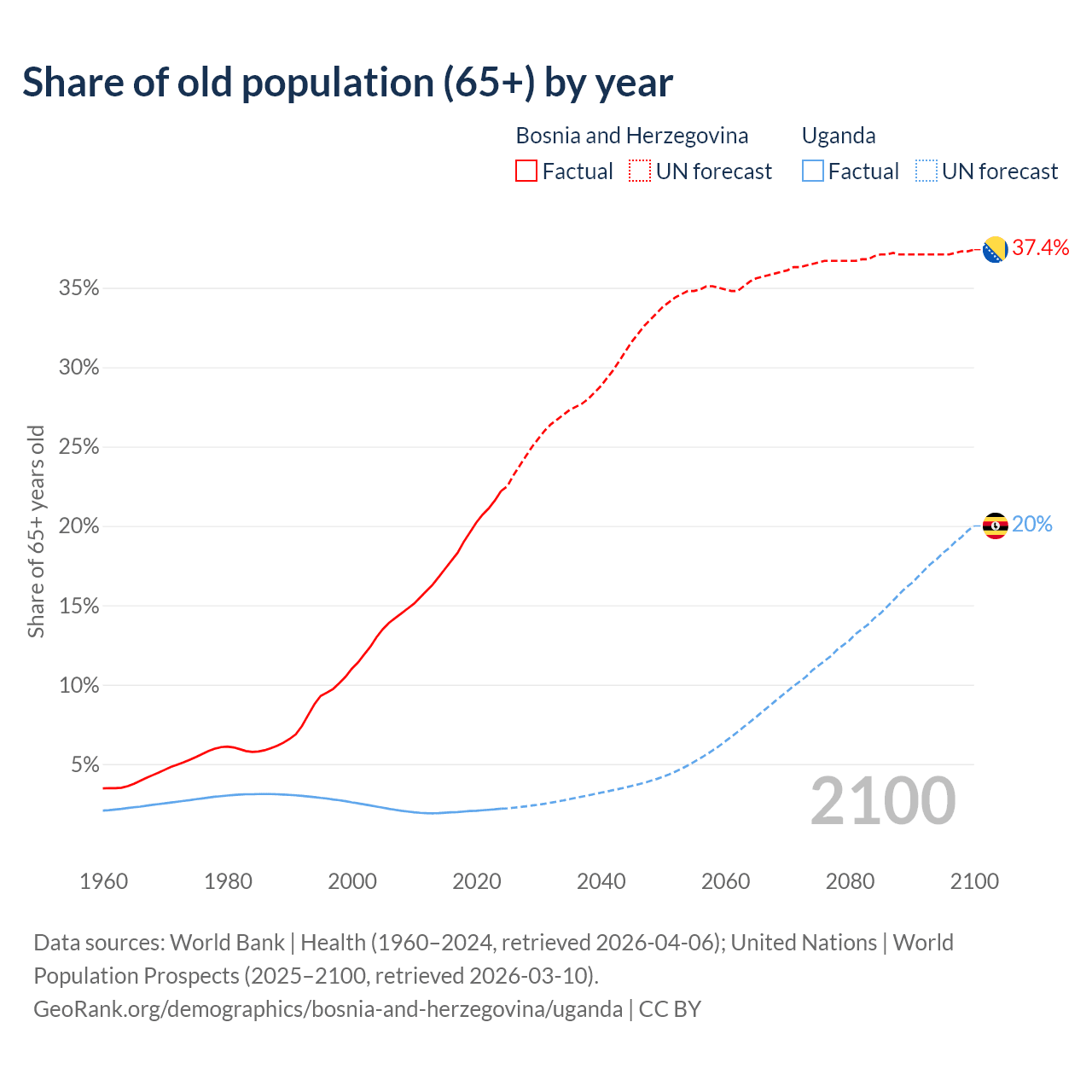 - The share of old-age demographic (65+) in Bosnia and Herzegovina is 22.2% vs 2.19% in Uganda.