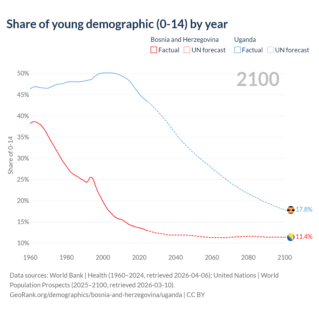 - The share of young demographic (0-15 years old) in Bosnia and Herzegovina is 13% vs 43.5% in Uganda.
