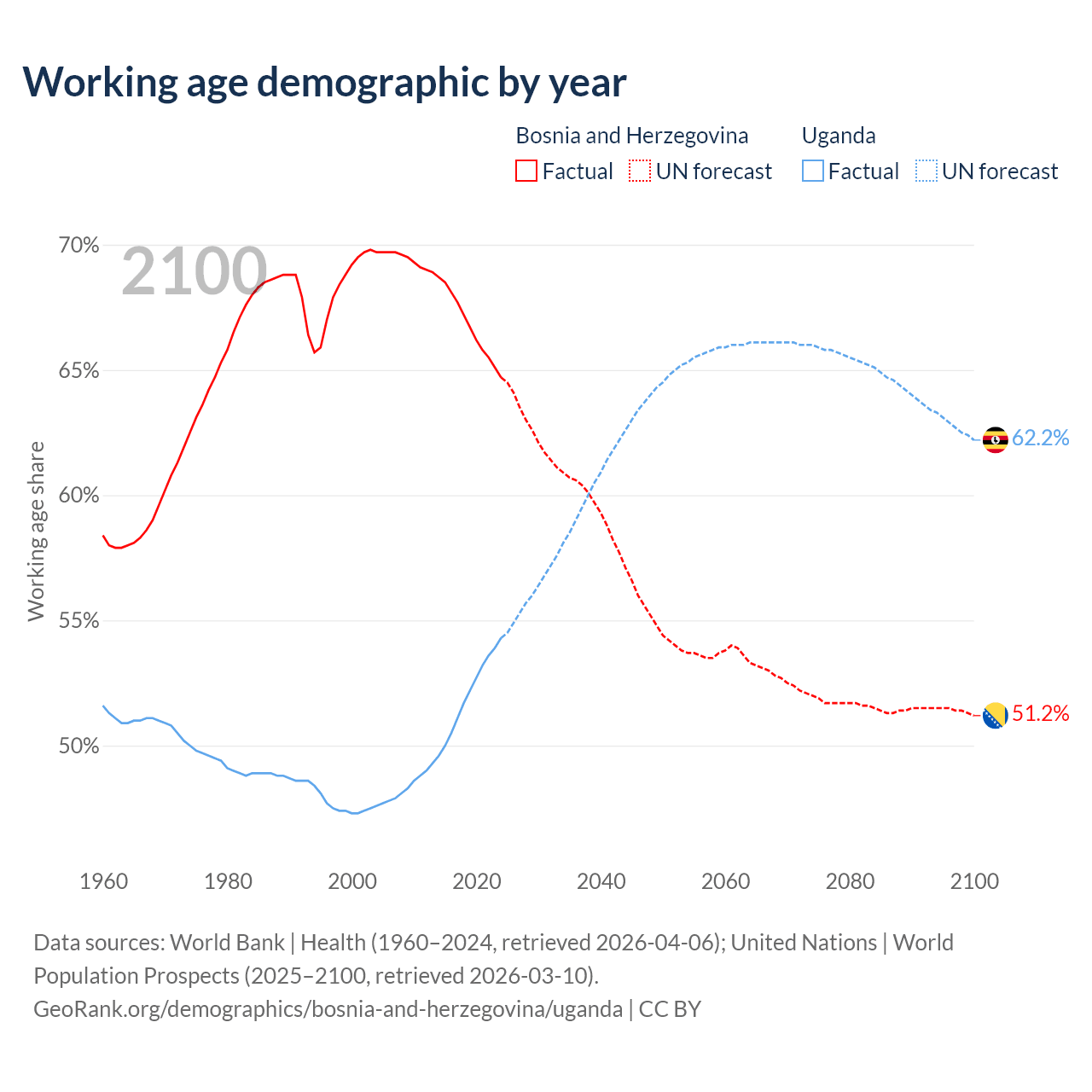 Median age Bosnia and Herzegovina vs Uganda, 1960-2100