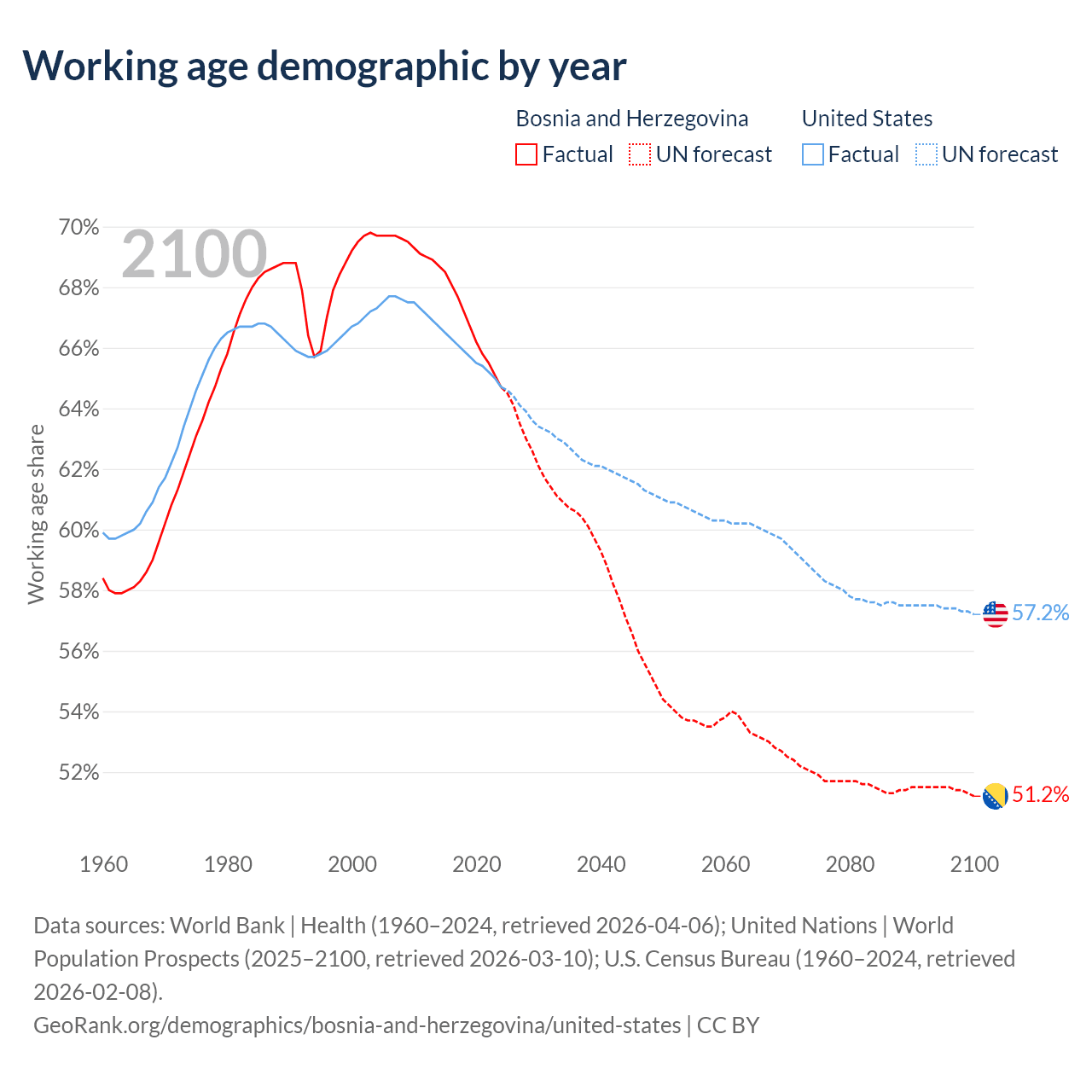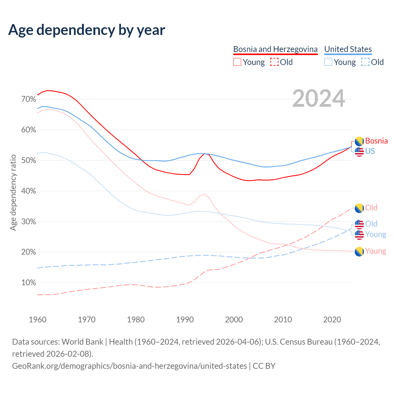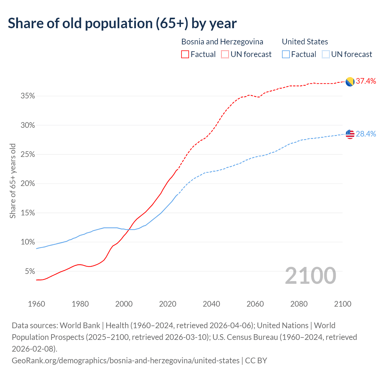- The share of old-age demographic (65+) in Bosnia and Herzegovina is 22.2% vs 17.9% in the United States.