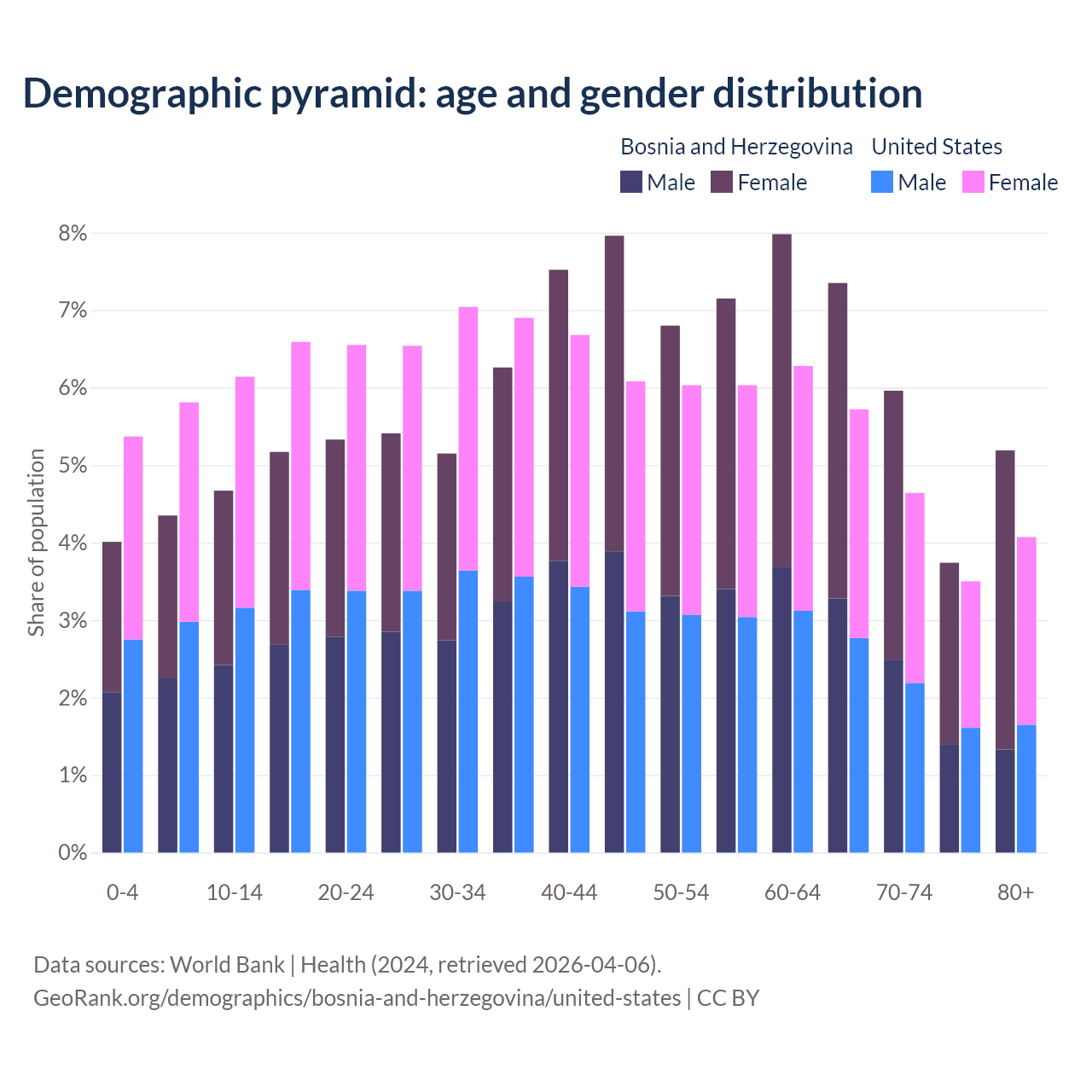 - Bosnia and Herzegovina is ranked 8/196 by median age (oldest to youngest) vs 50/196 for the United States.