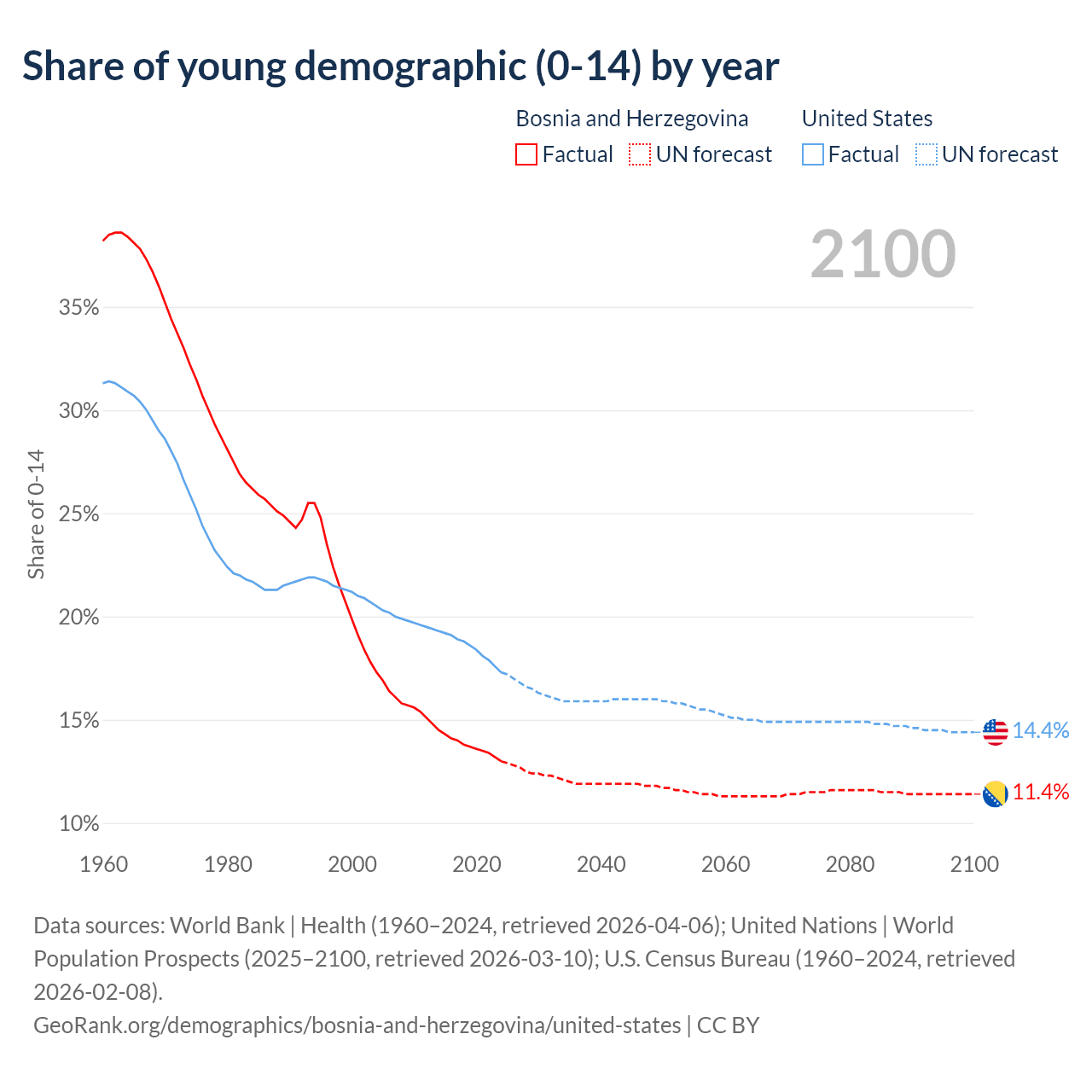 - The share of young demographic (0-15 years old) in Bosnia and Herzegovina is 13% vs 17.3% in the United States.