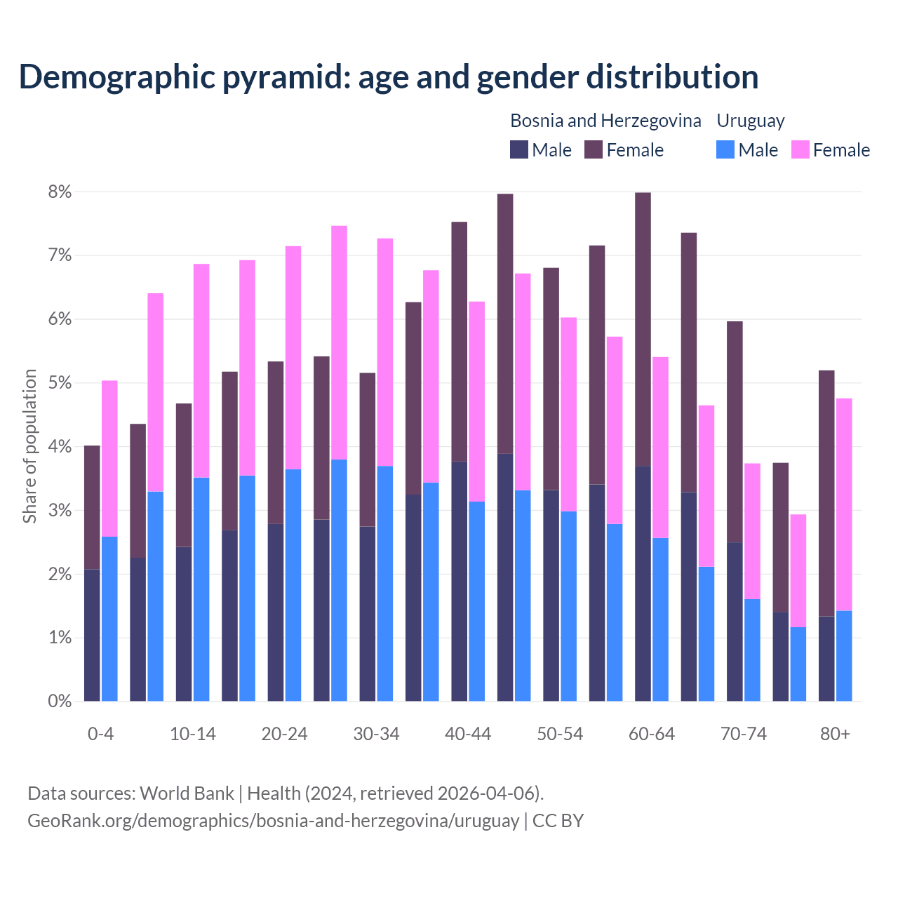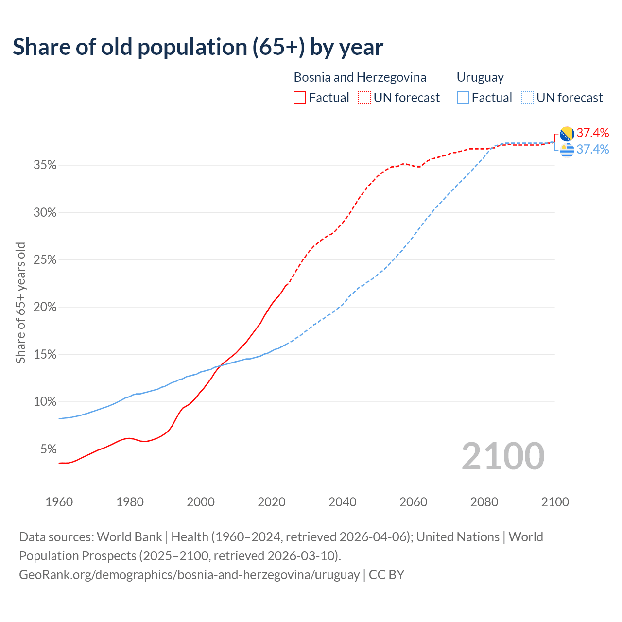 The share of older people aged 65 and over is 22.2% in Bosnia and Herzegovina and 16% in Uruguay. Life expectancy in Bosnia and Herzegovina compared to Uruguay .