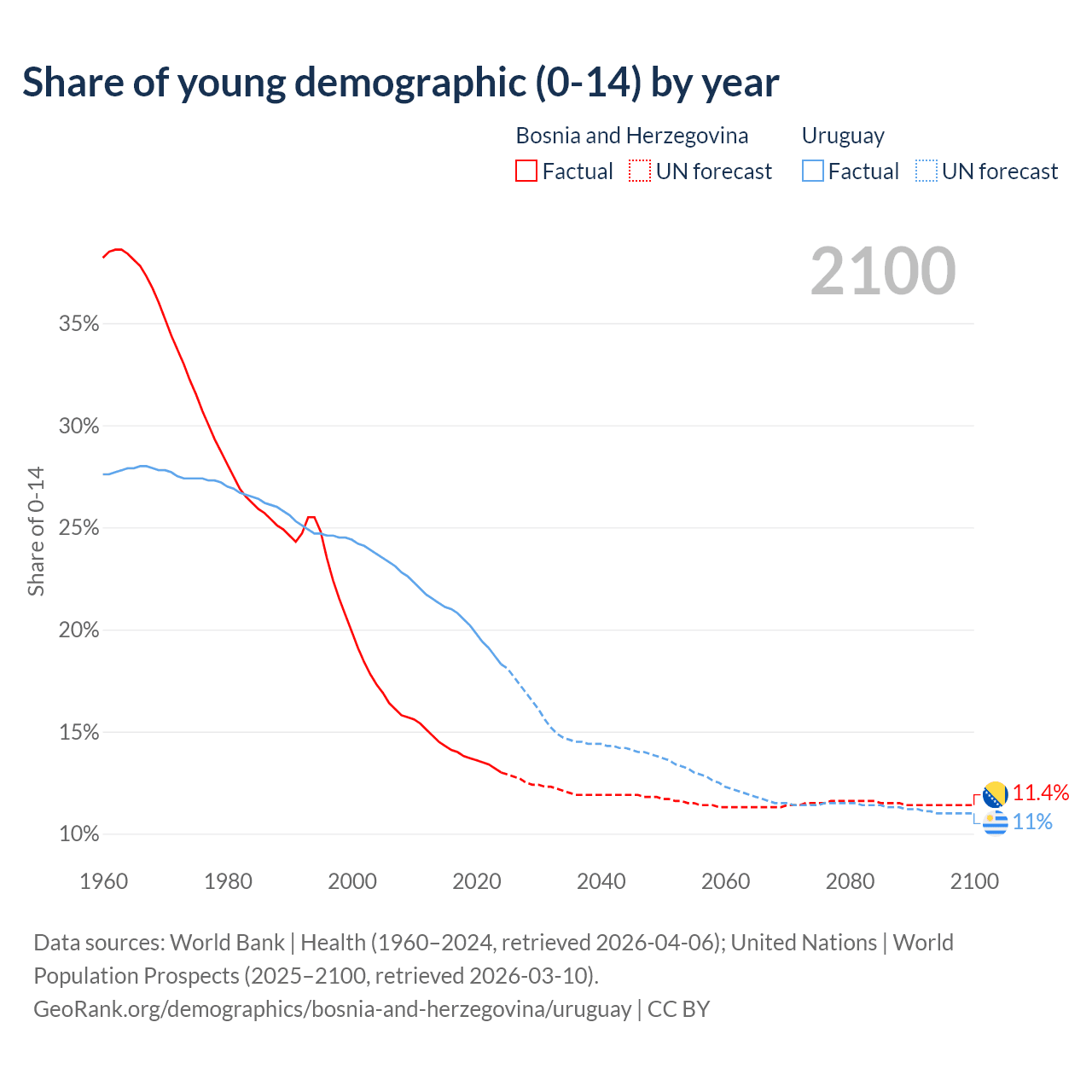 - The share of young demographic (0-15 years old) in Bosnia and Herzegovina is 13% vs 18.3% in Uruguay.