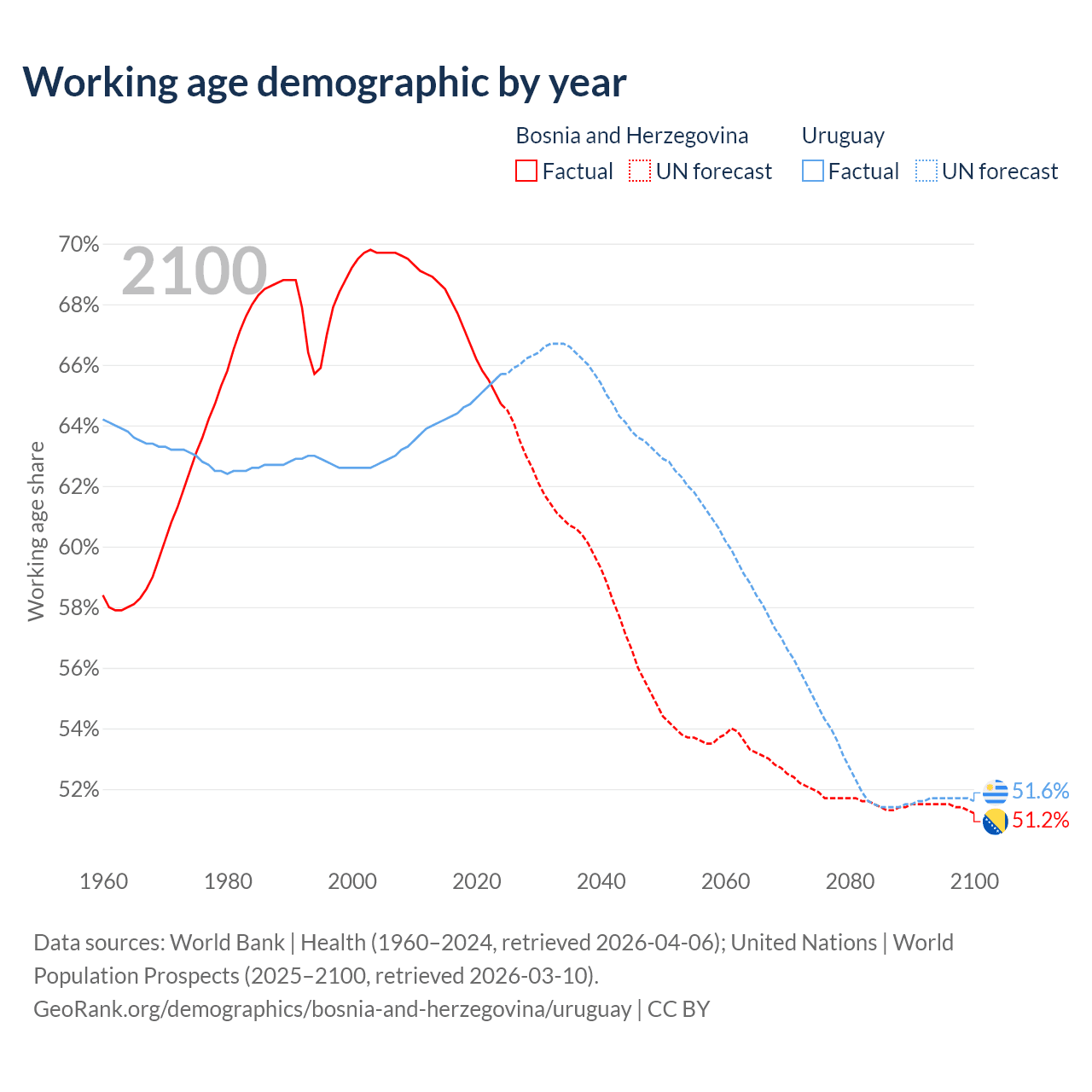 Median age Bosnia and Herzegovina vs Uruguay, 1960-2100
