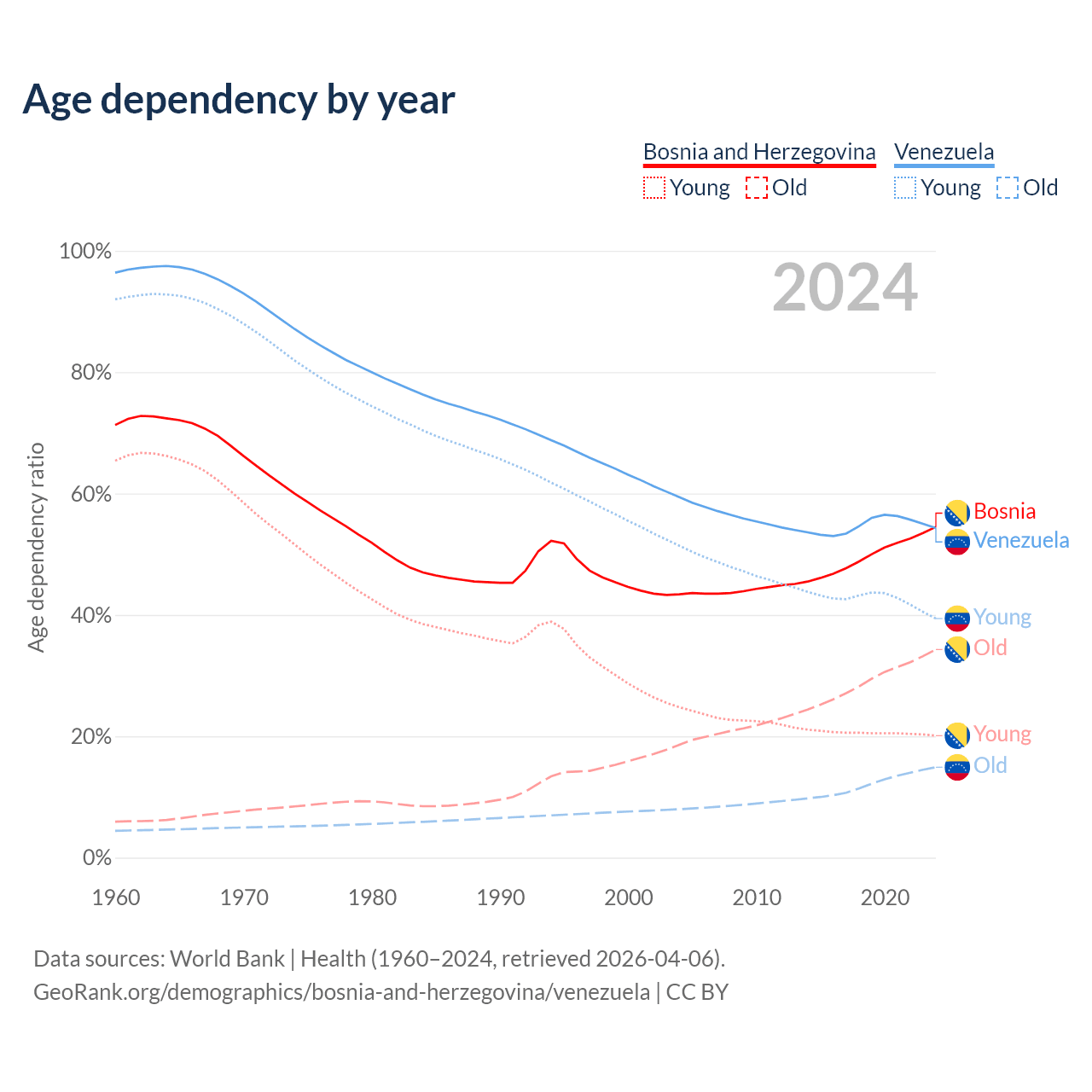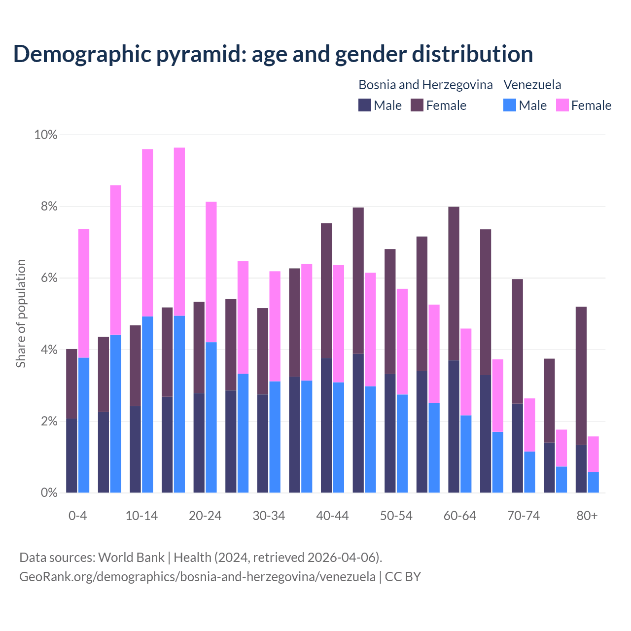 - Bosnia and Herzegovina is ranked 8/196 by median age (oldest to youngest) vs 104/196 for Venezuela.