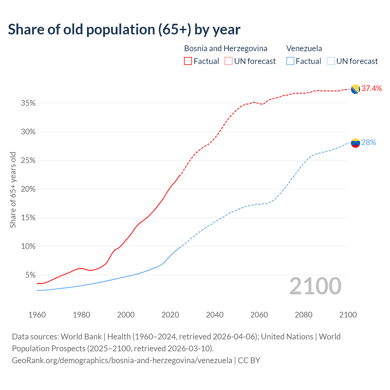 - The share of old-age demographic (65+) in Bosnia and Herzegovina is 22.2% vs 9.68% in Venezuela.