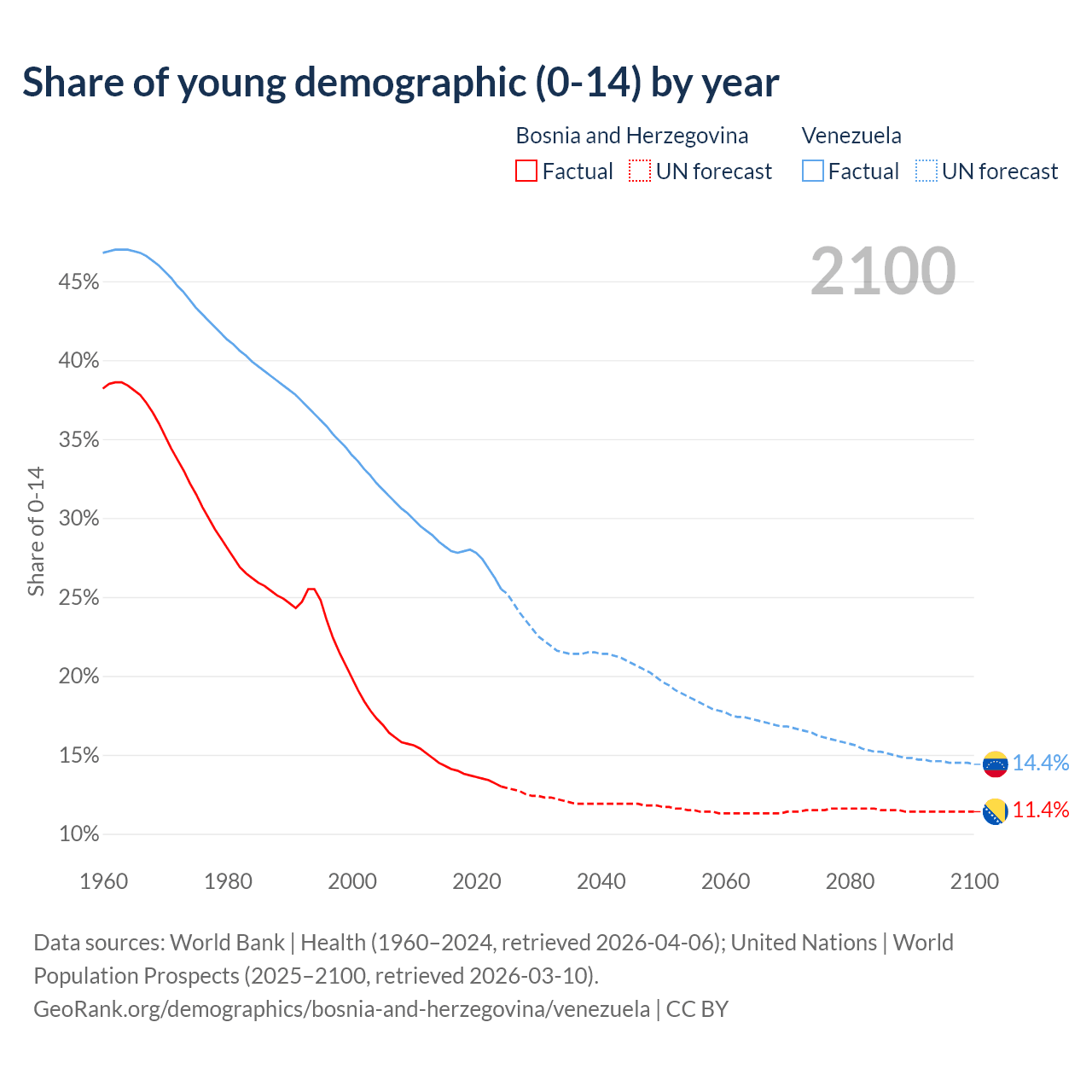 - The share of young demographic (0-15 years old) in Bosnia and Herzegovina is 13% vs 25.5% in Venezuela.