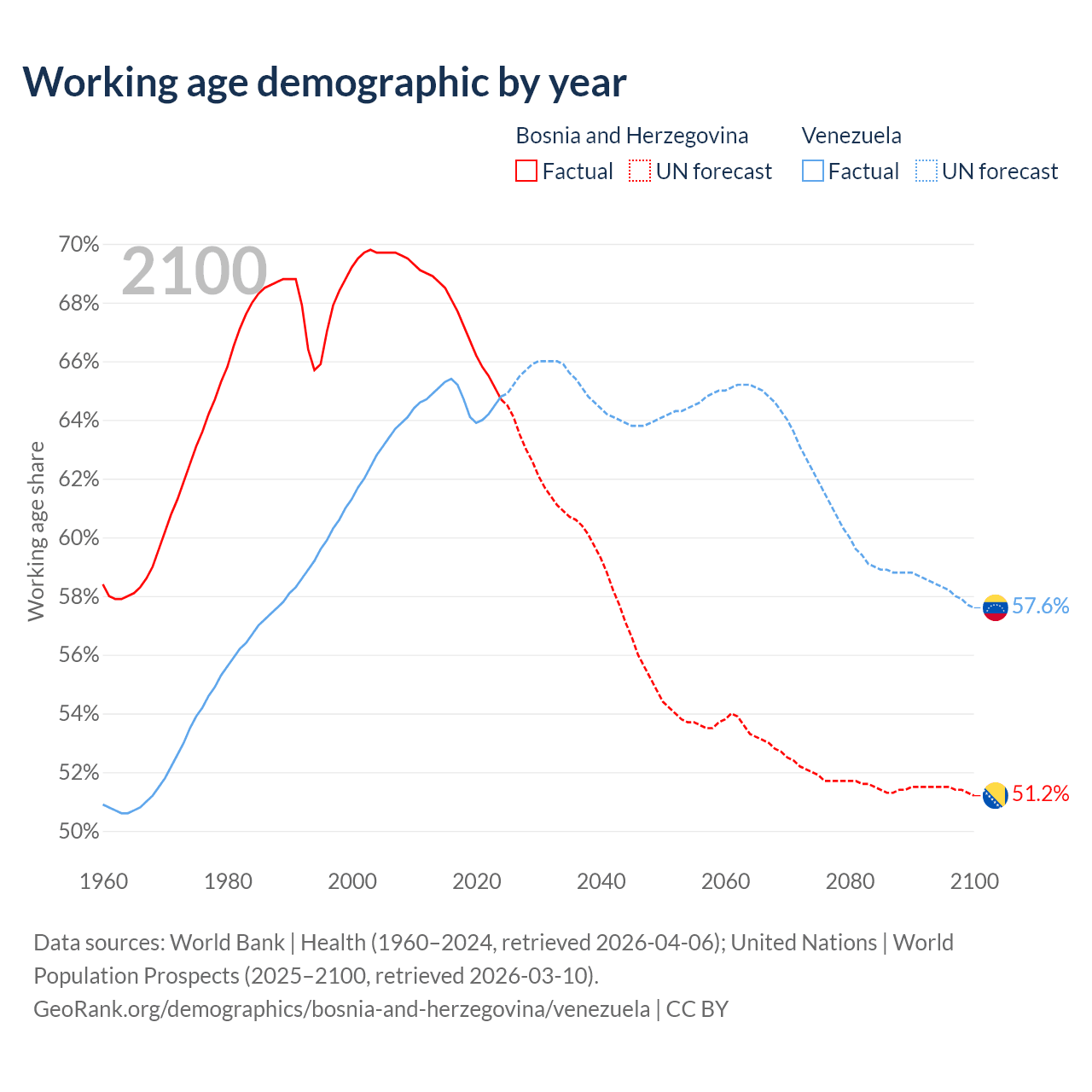 Median age Bosnia and Herzegovina vs Venezuela, 1960-2100