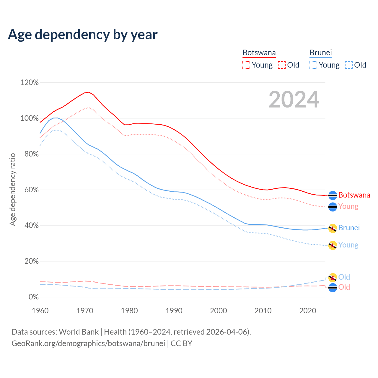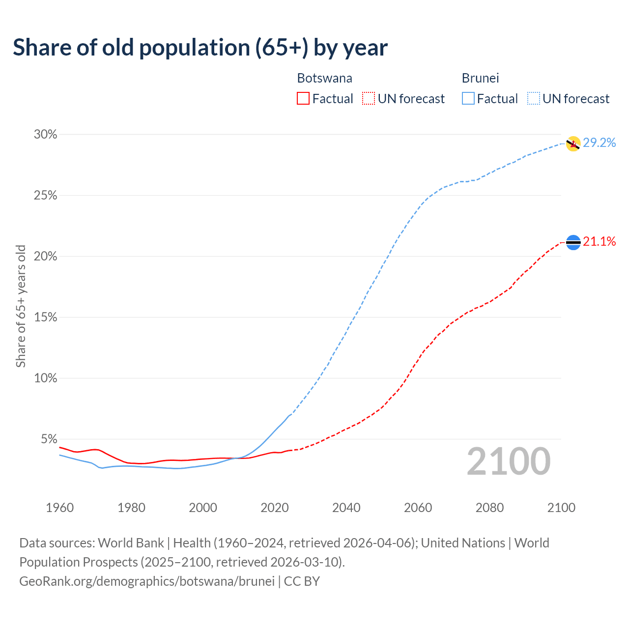 - The share of old-age demographic (65+) in Botswana is 4.04% vs 6.87% in Brunei.