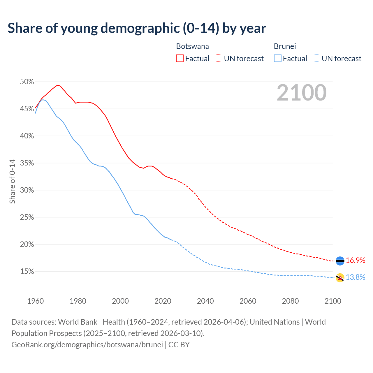 - The share of young demographic (0-15 years old) in Botswana is 32.1% vs 20.8% in Brunei.