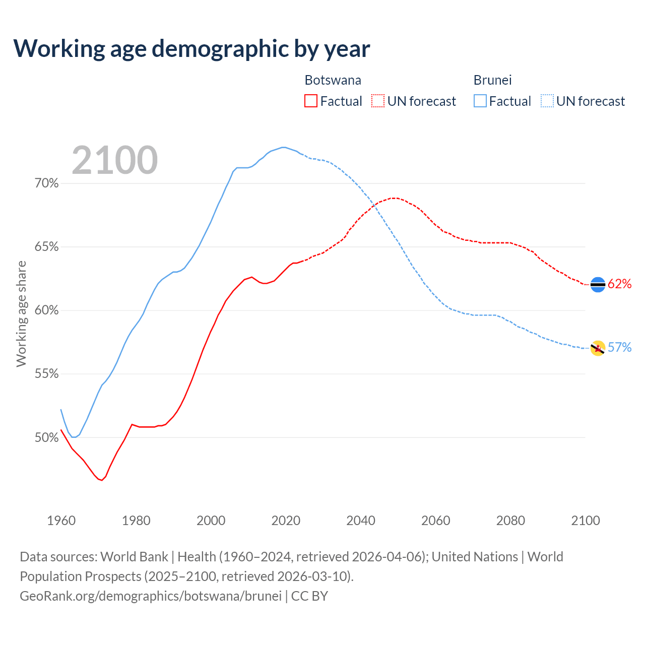 Median age Botswana vs Brunei, 1960-2100