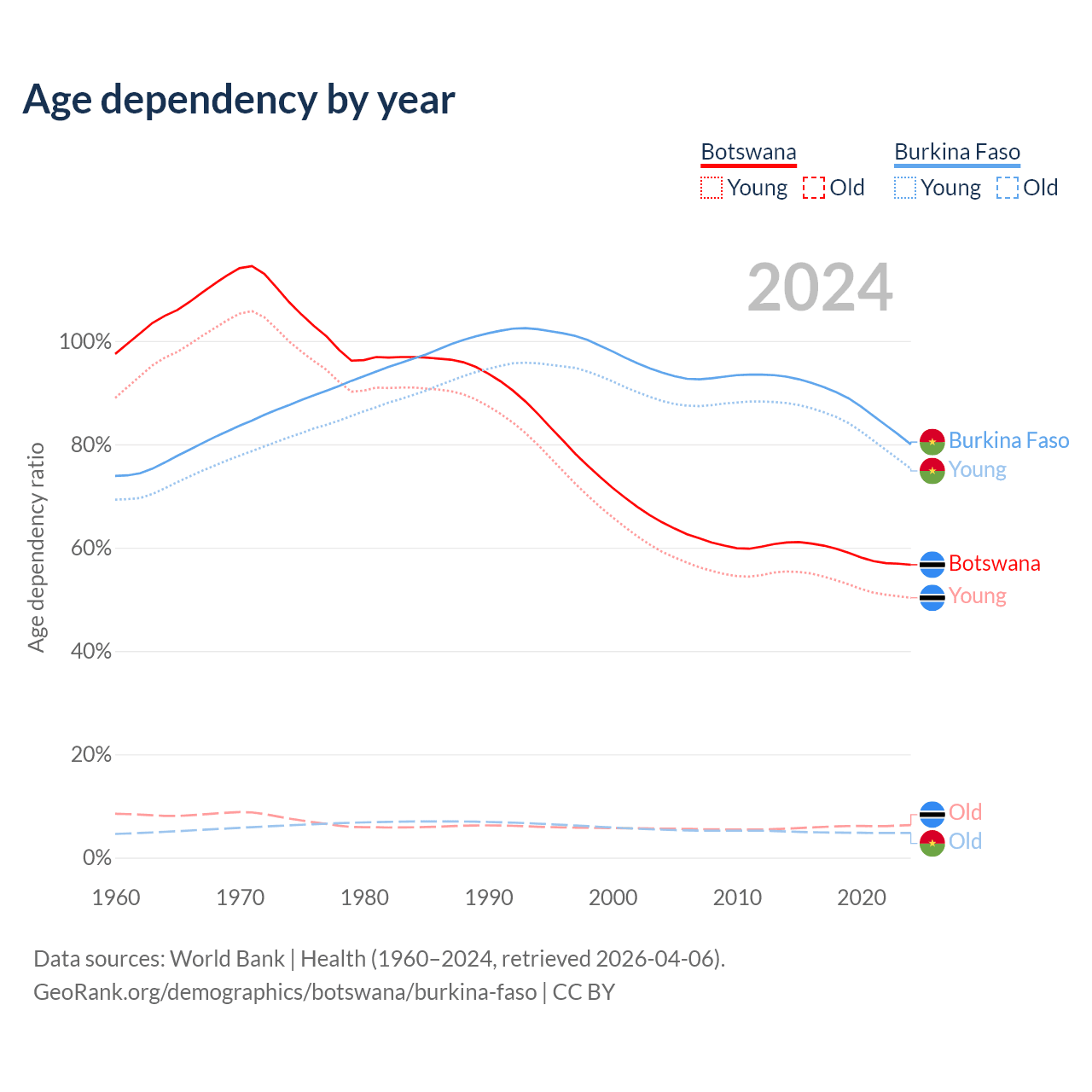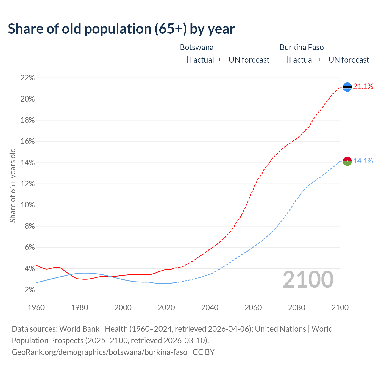 - The share of old-age demographic (65+) in Botswana is 4.04% vs 2.65% in Burkina Faso.