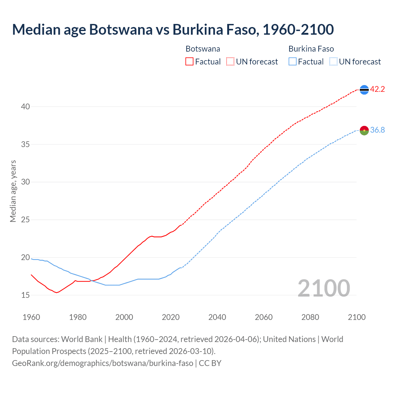 - Botswana is ranked 136/196 by median age (oldest to youngest) vs 183/196 for Burkina Faso.
