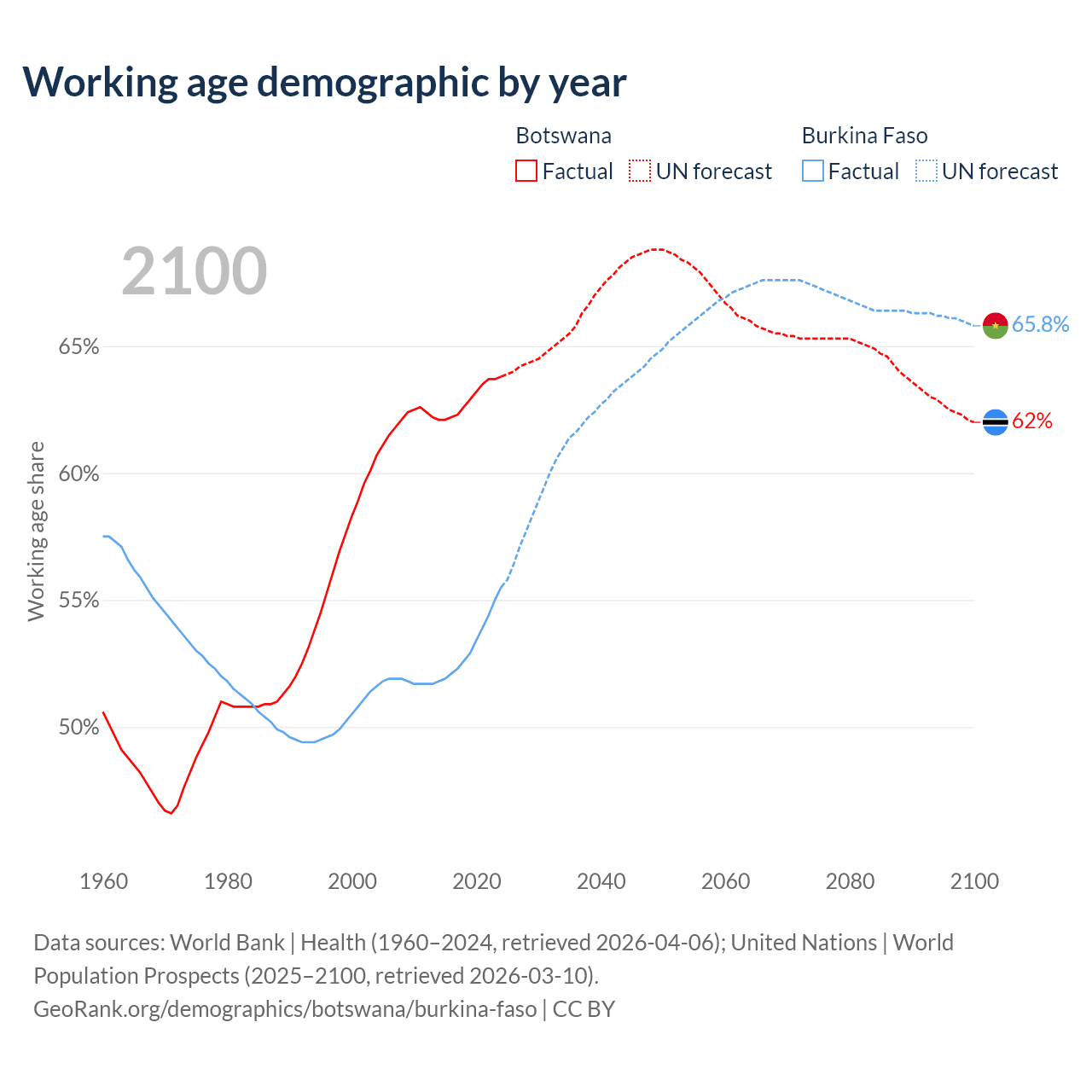 - Botswana has 1.67M working age adults (aged 15-64) vs 13.8M in Burkina Faso.