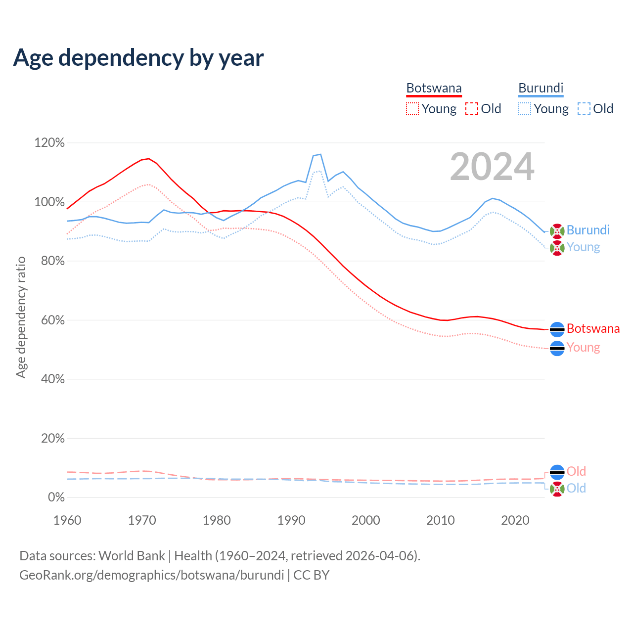 - Botswana is ranked 136/196 by median age (oldest to youngest) vs 190/196 for Burundi.