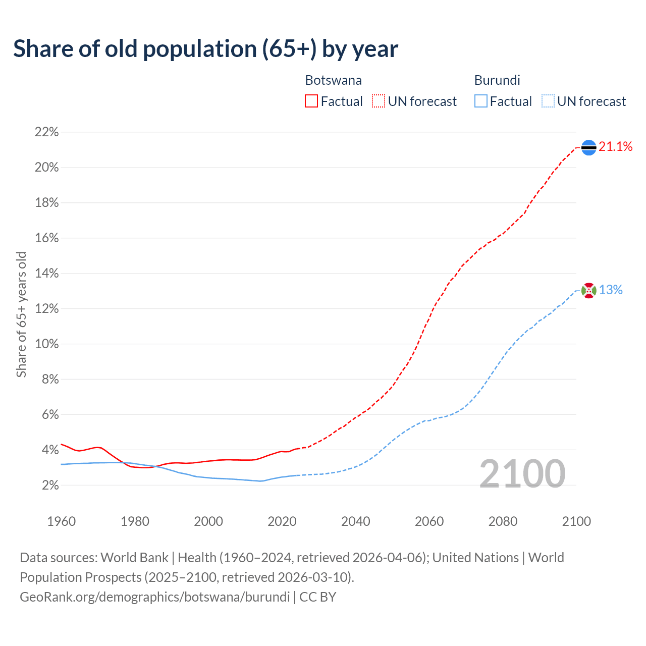 - The share of old-age demographic (65+) in Botswana is 4.04% vs 2.53% in Burundi.