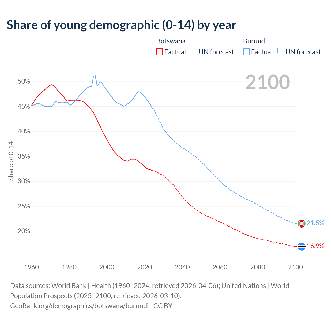 - The share of young demographic (0-15 years old) in Botswana is 32.1% vs 44.7% in Burundi.