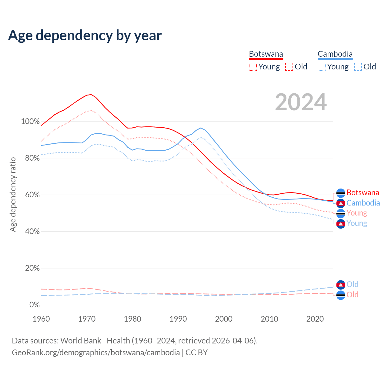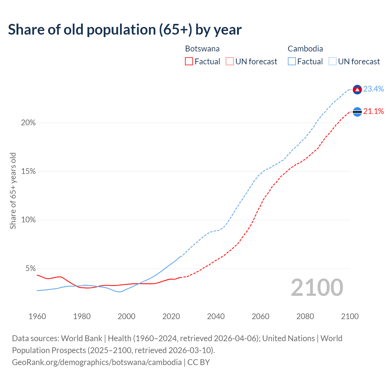 - The share of old-age demographic (65+) in Botswana is 4.04% vs 6.16% in Cambodia.