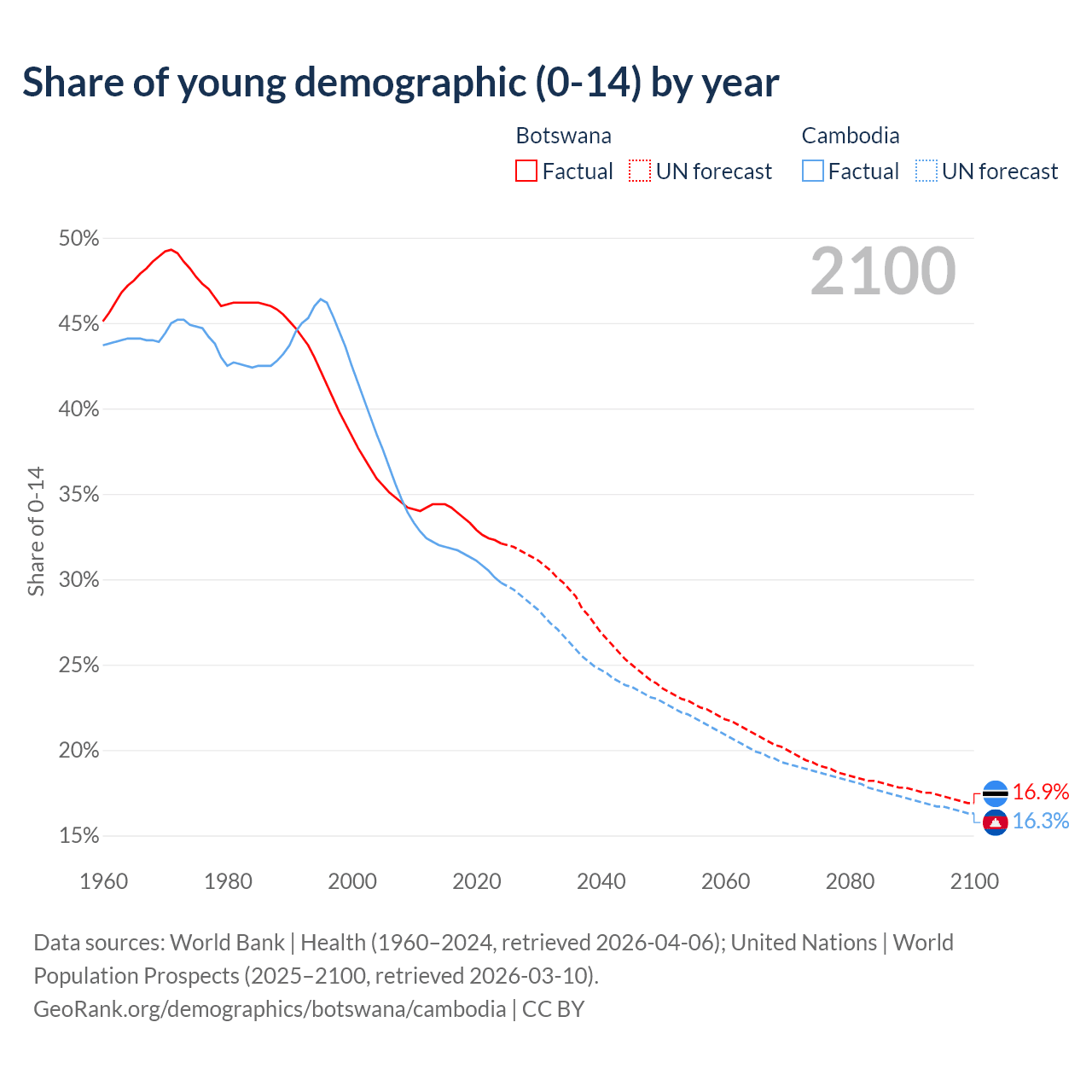 - The share of young demographic (0-15 years old) in Botswana is 32.1% vs 29.8% in Cambodia.