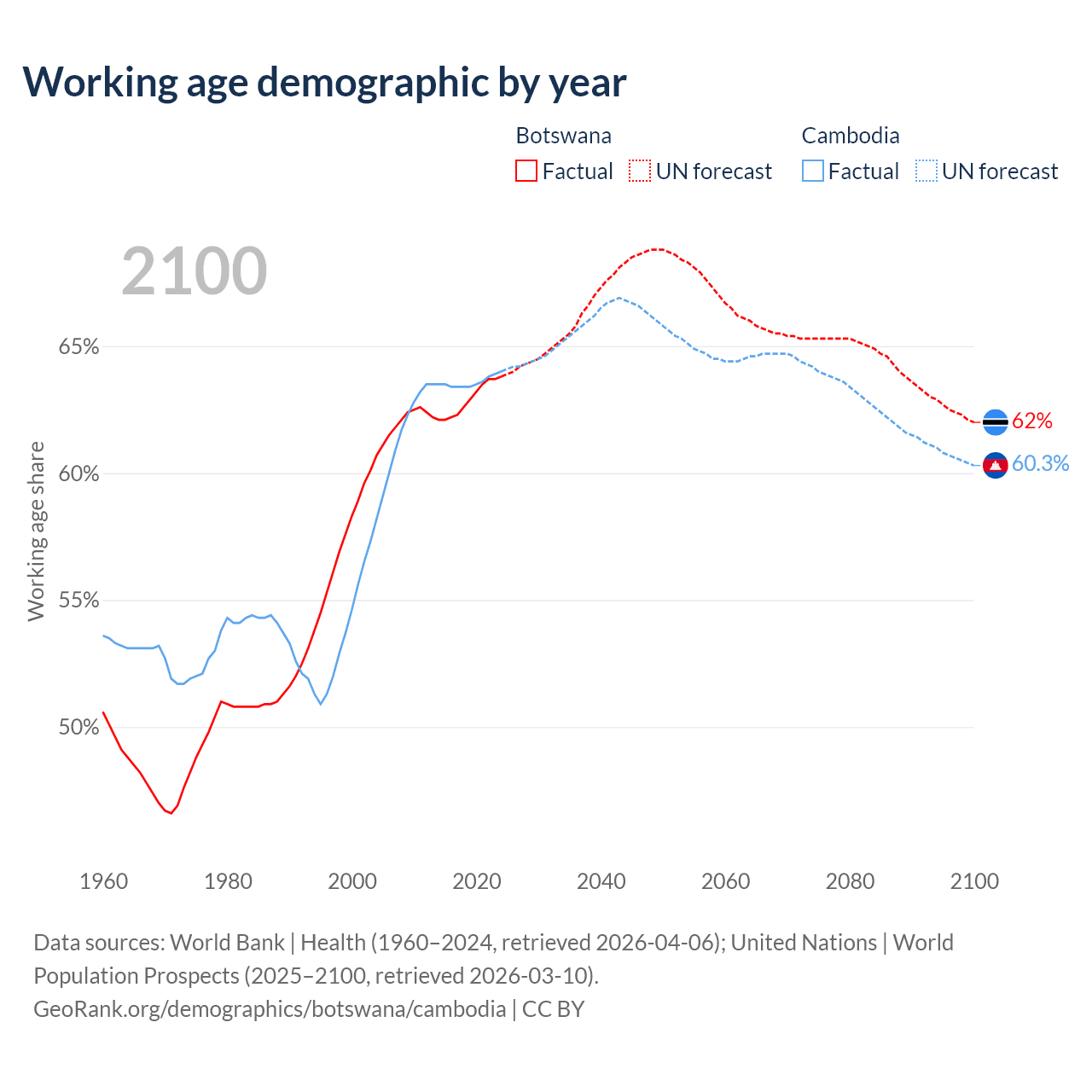 The share of older people aged 65 and over is 4.04% in Botswana and 6.16% in Cambodia. Life expectancy in Botswana compared to Cambodia .