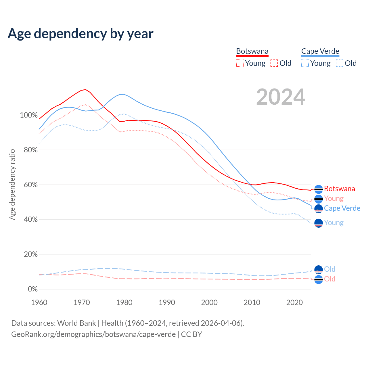- The share of old-age demographic (65+) in Botswana is 4.04% vs 6.86% in Cape Verde.