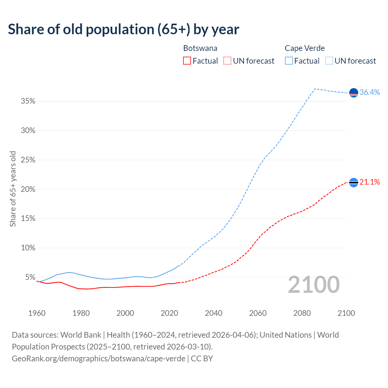 The share of older people aged 65 and over is 4.04% in Botswana and 6.86% in Cape Verde. Life expectancy in Botswana compared to Cape Verde .