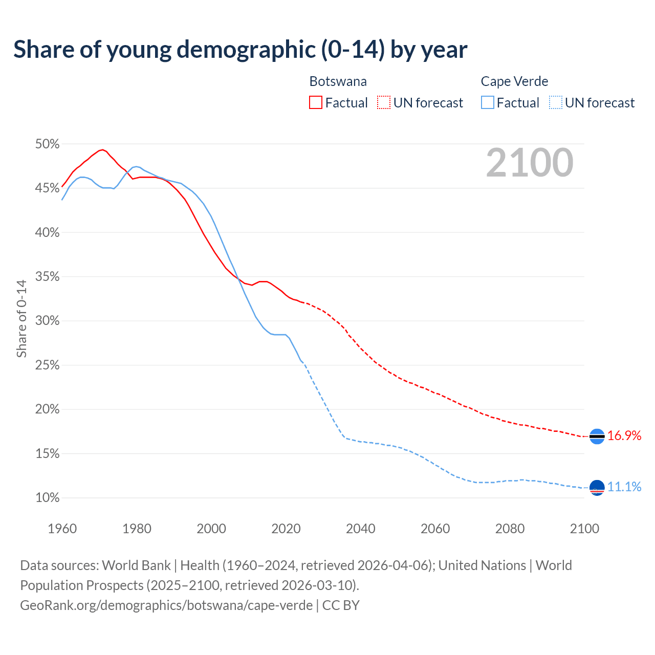 - The share of young demographic (0-15 years old) in Botswana is 32.1% vs 25.5% in Cape Verde.