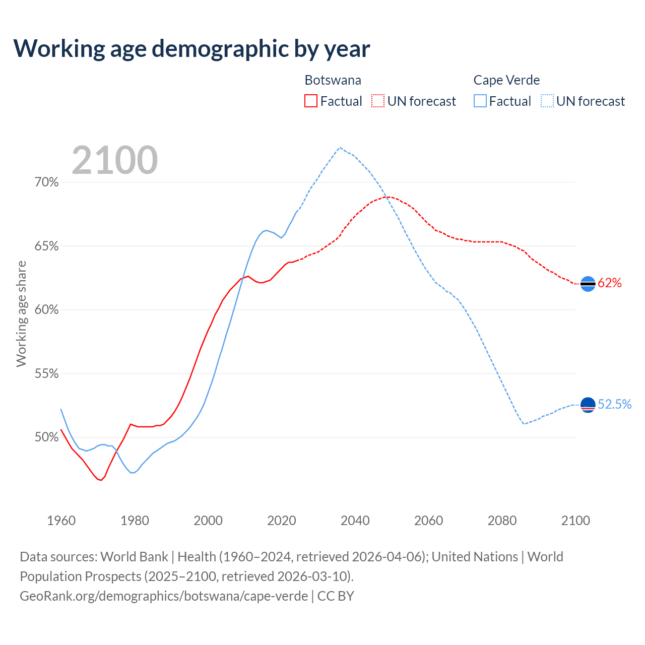 - Botswana has 1.67M working age adults (aged 15-64) vs 359K in Cape Verde.
