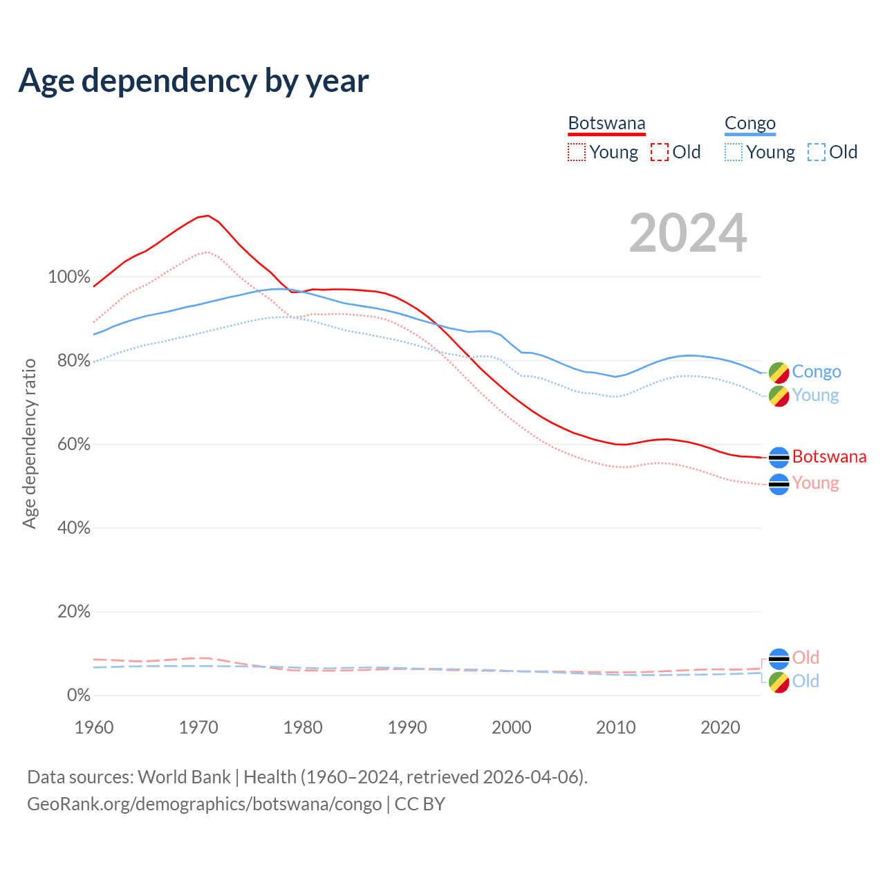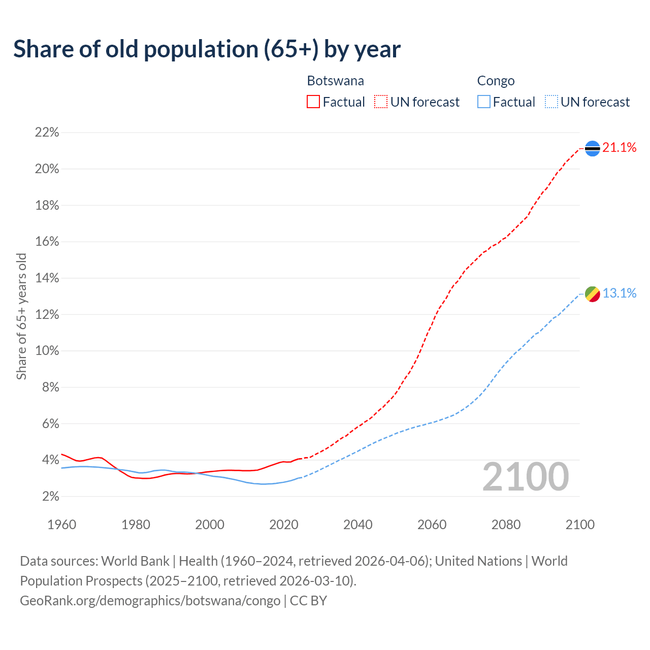 - The share of old-age demographic (65+) in Botswana is 4.04% vs 2.99% in the Congo.