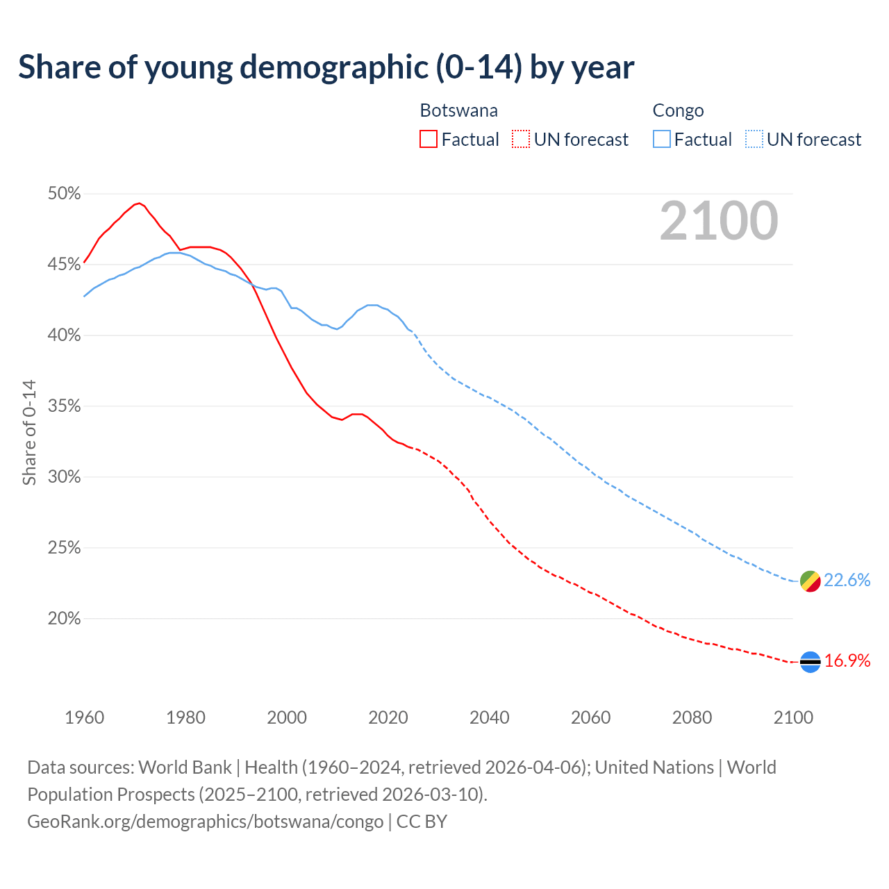 - The share of young demographic (0-15 years old) in Botswana is 32.1% vs 40.4% in the Congo.