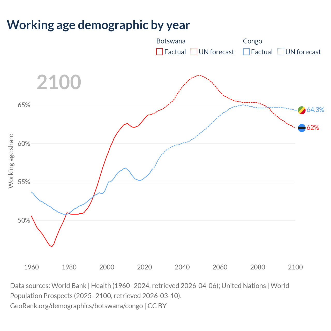 - Botswana has 1.67M working age adults (aged 15-64) vs 3.78M in the Congo.
