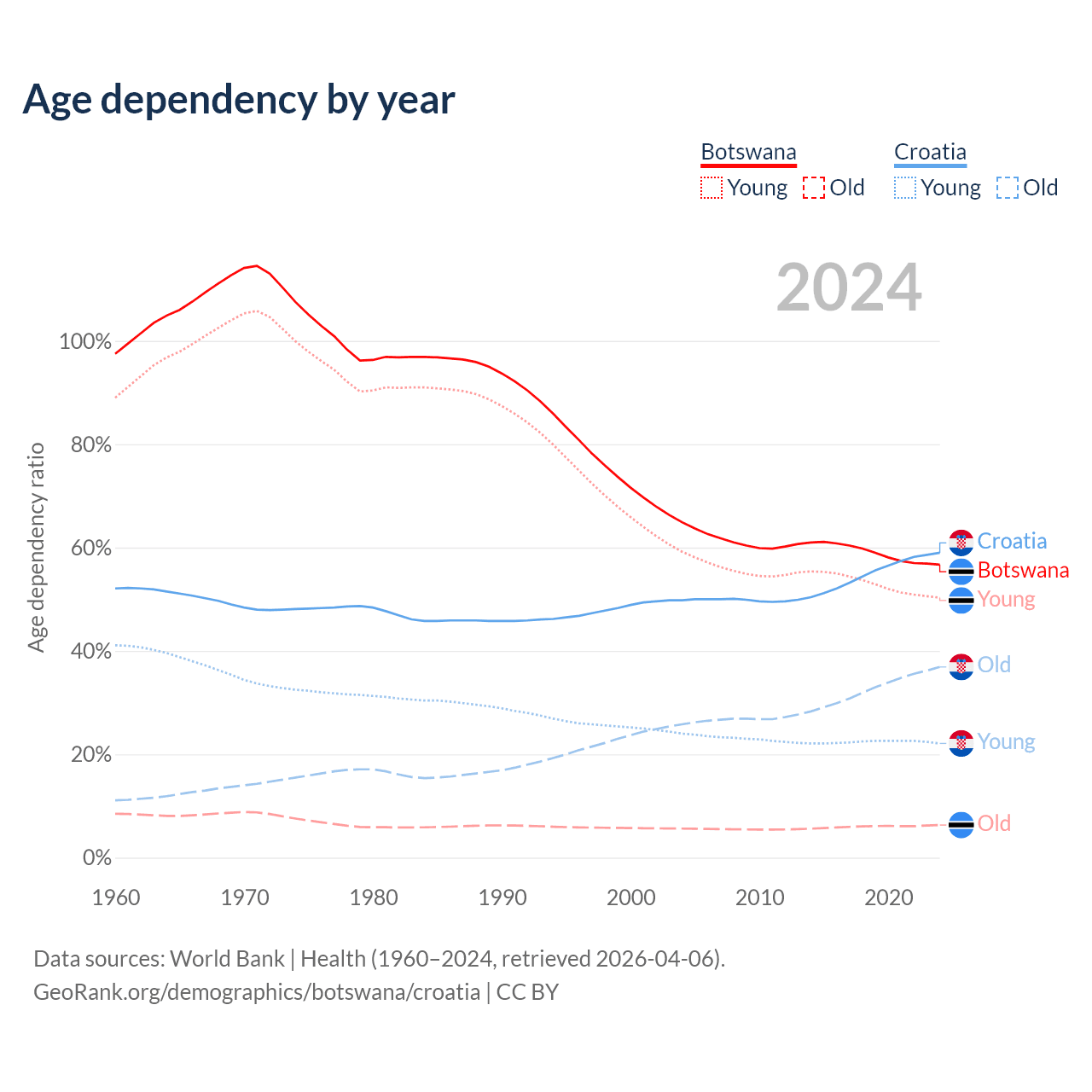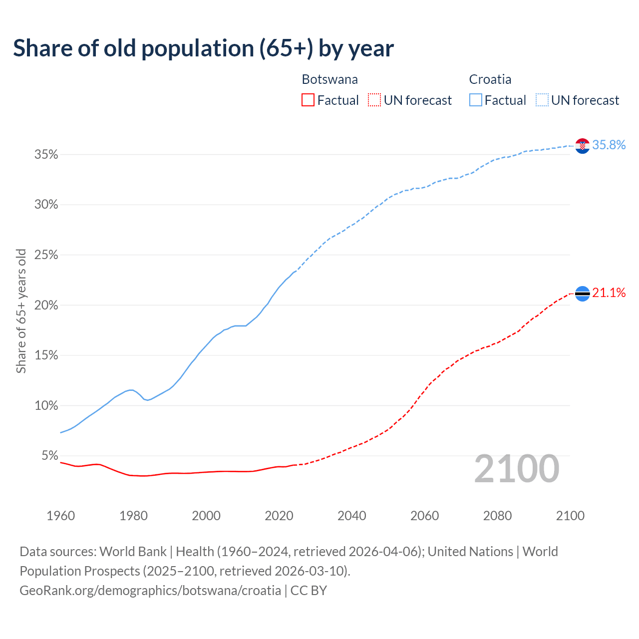 The share of older people aged 65 and over is 4.04% in Botswana and 23.2% in Croatia. Life expectancy in Botswana compared to Croatia .