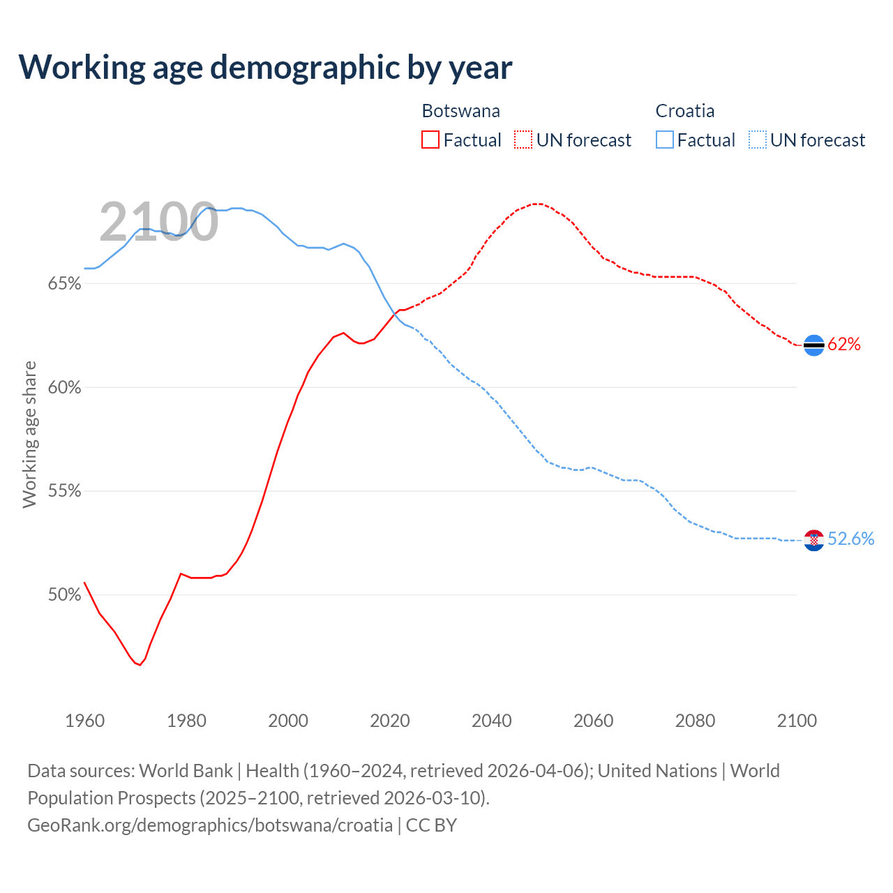 Median age Botswana vs Croatia, 1960-2100