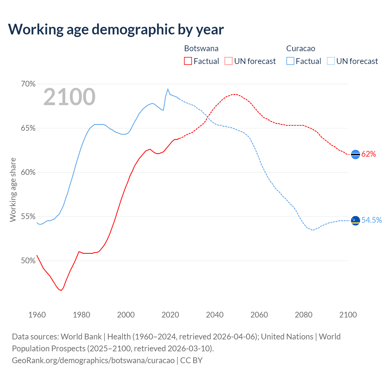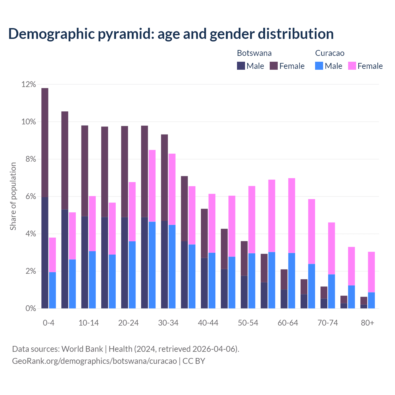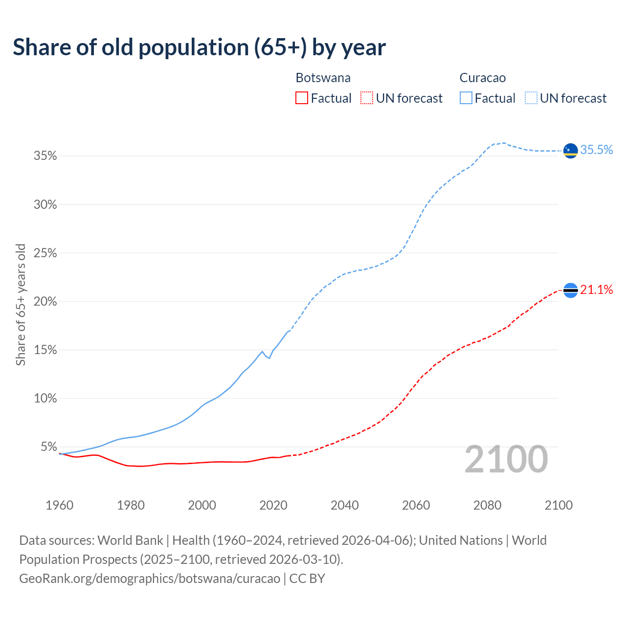 - The share of old-age demographic (65+) in Botswana is 4.04% vs 16.8% in Curacao.