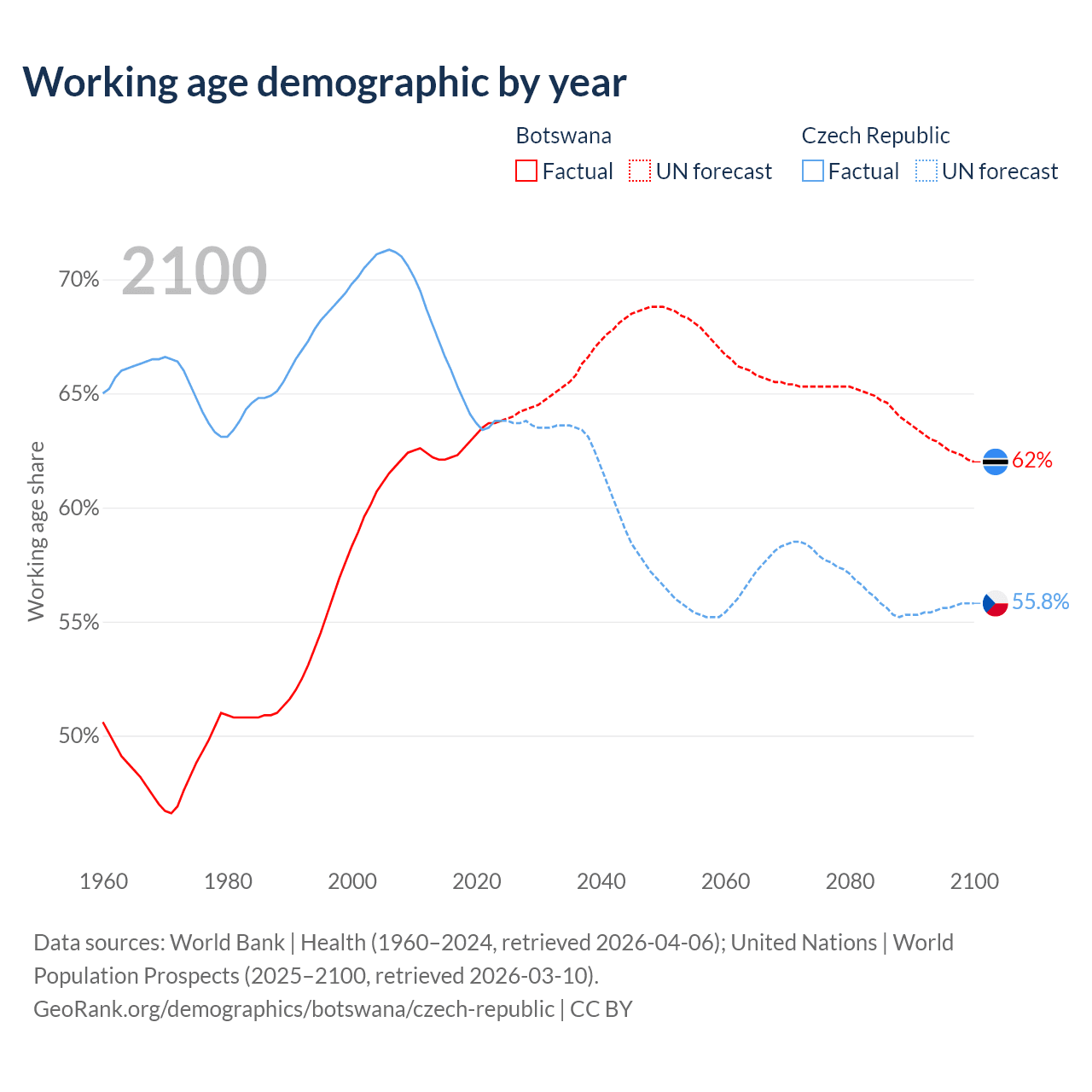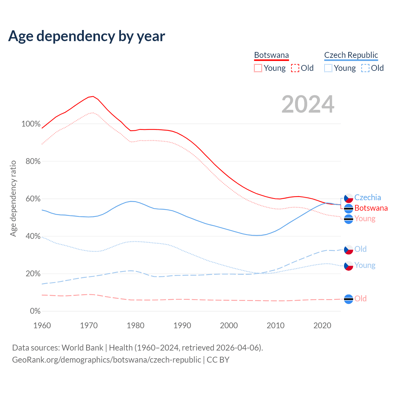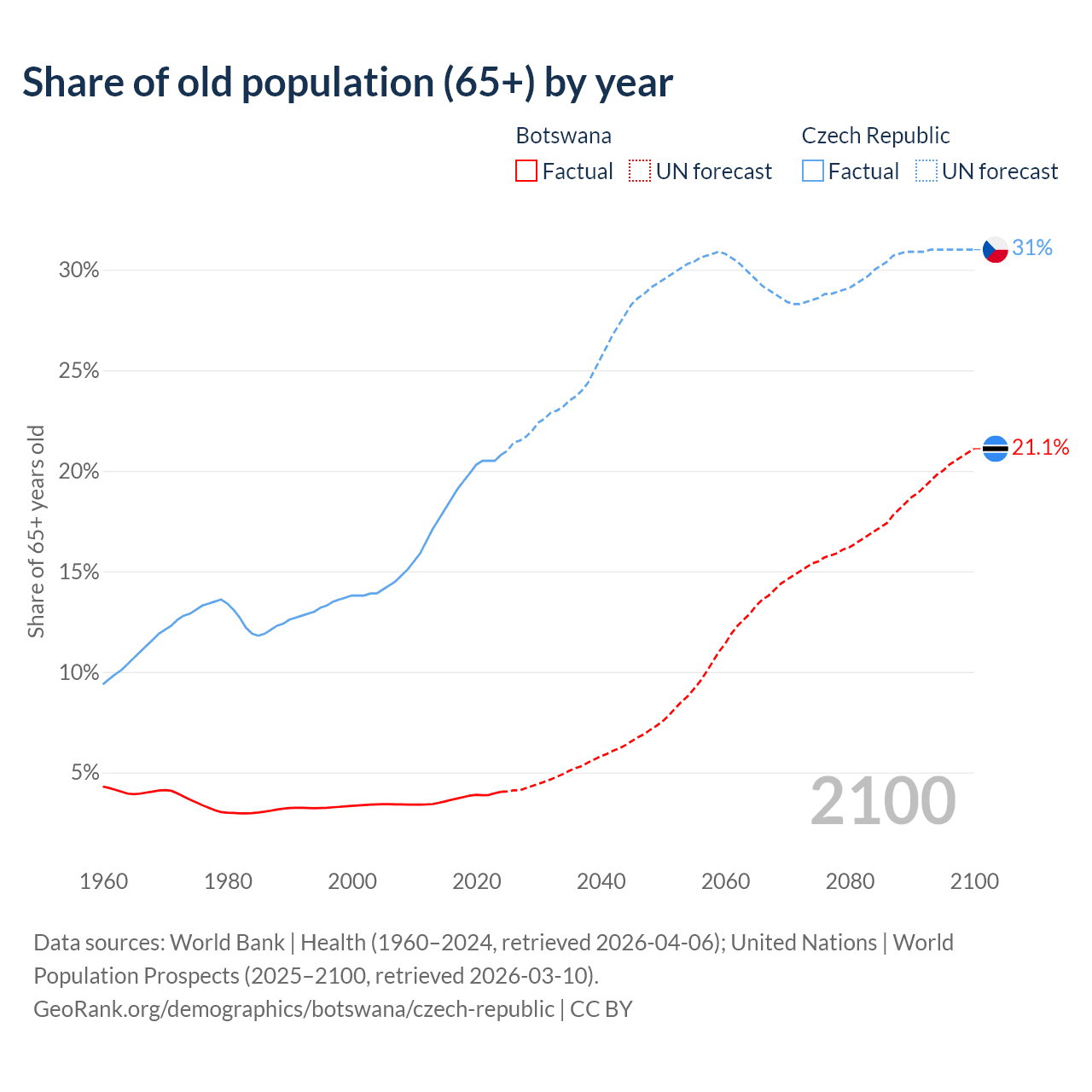 The share of older people aged 65 and over is 4.04% in Botswana and 20.8% in the Czech Republic. Life expectancy in Botswana compared to the Czech Republic .