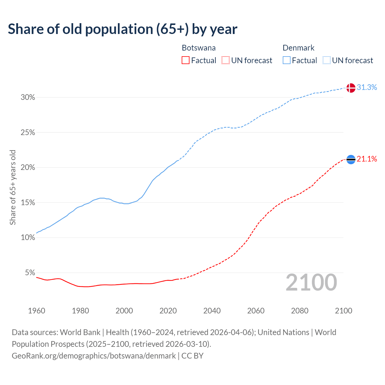 - The share of old-age demographic (65+) in Botswana is 4.04% vs 20.9% in Denmark.