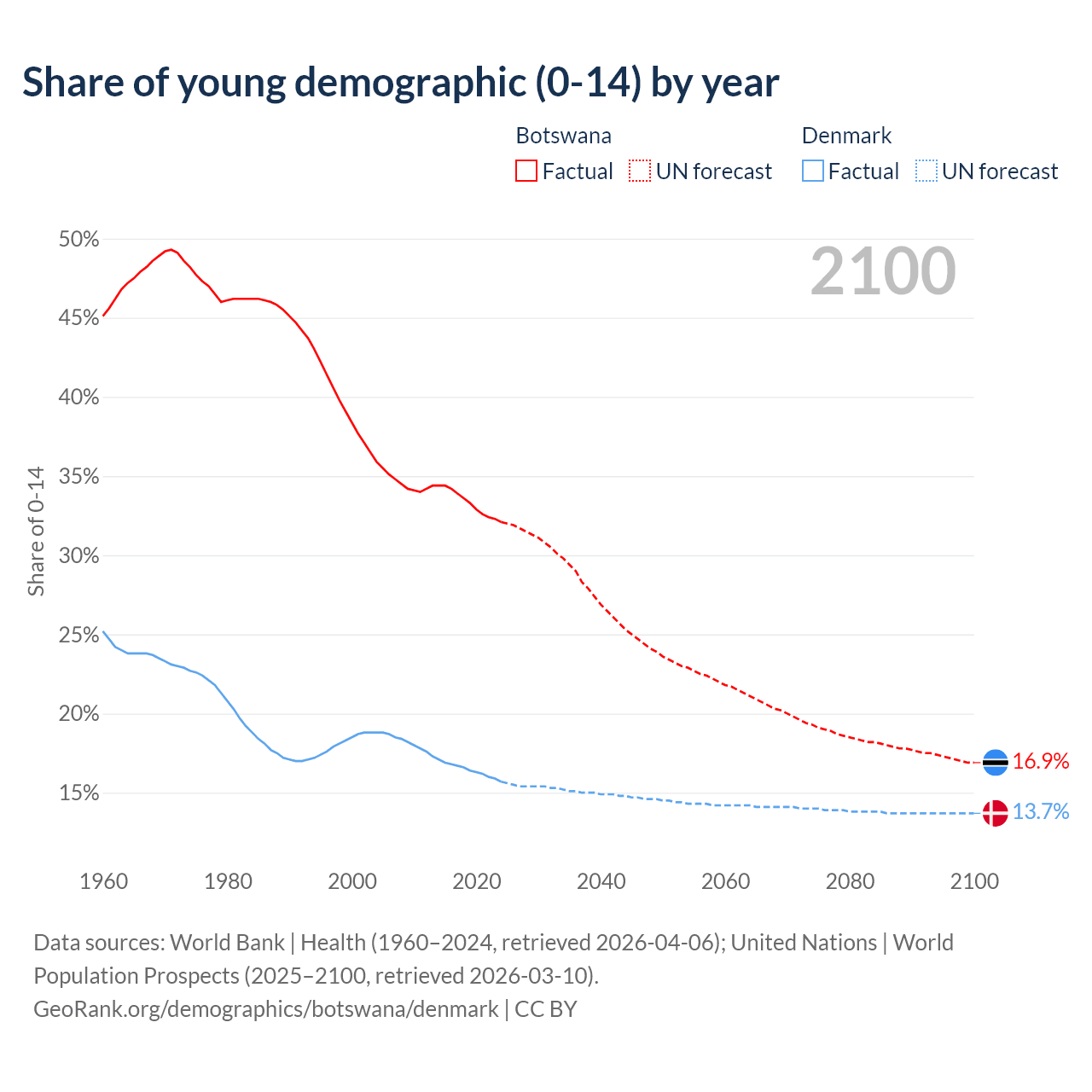 - The share of young demographic (0-15 years old) in Botswana is 32.1% vs 15.7% in Denmark.