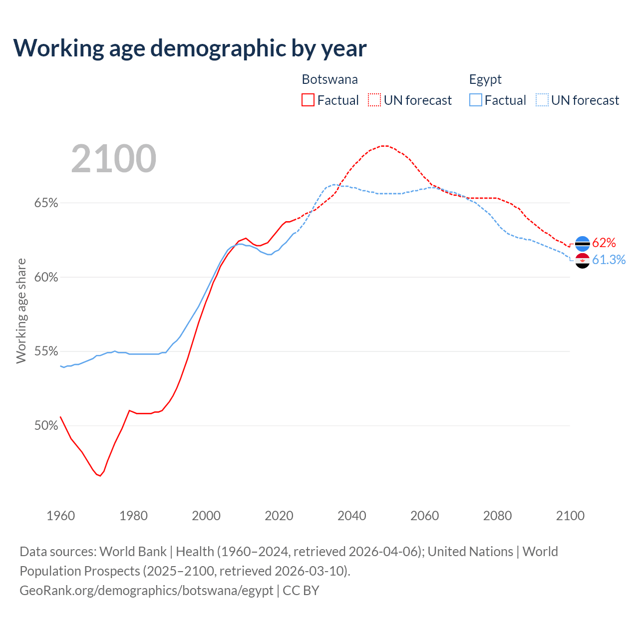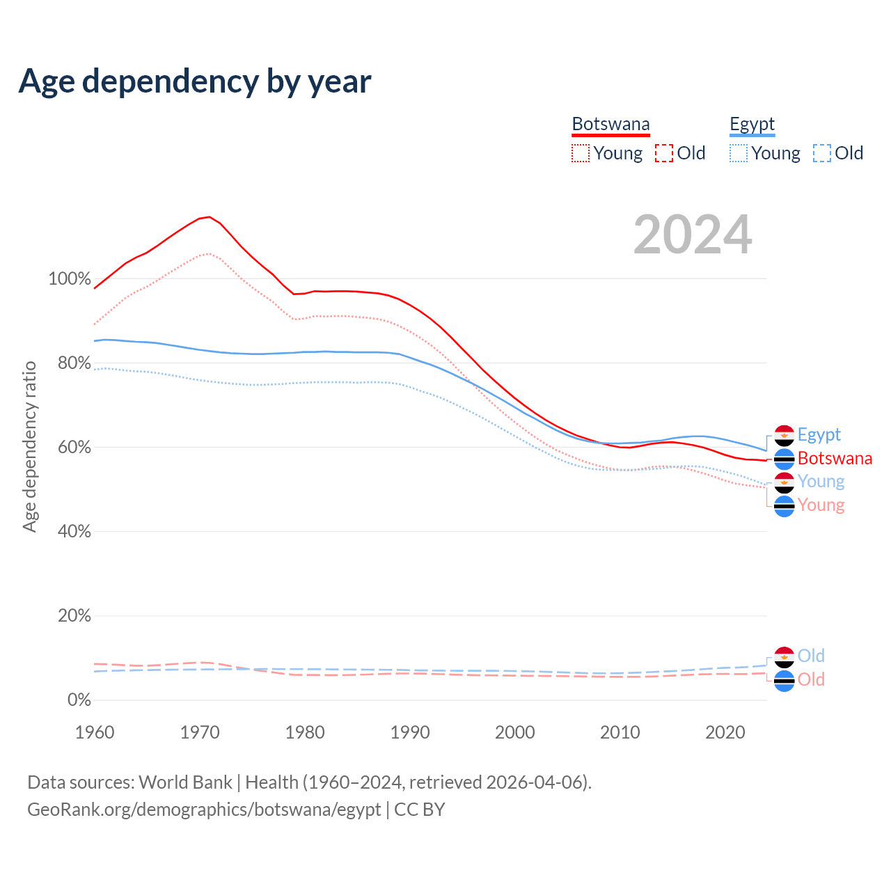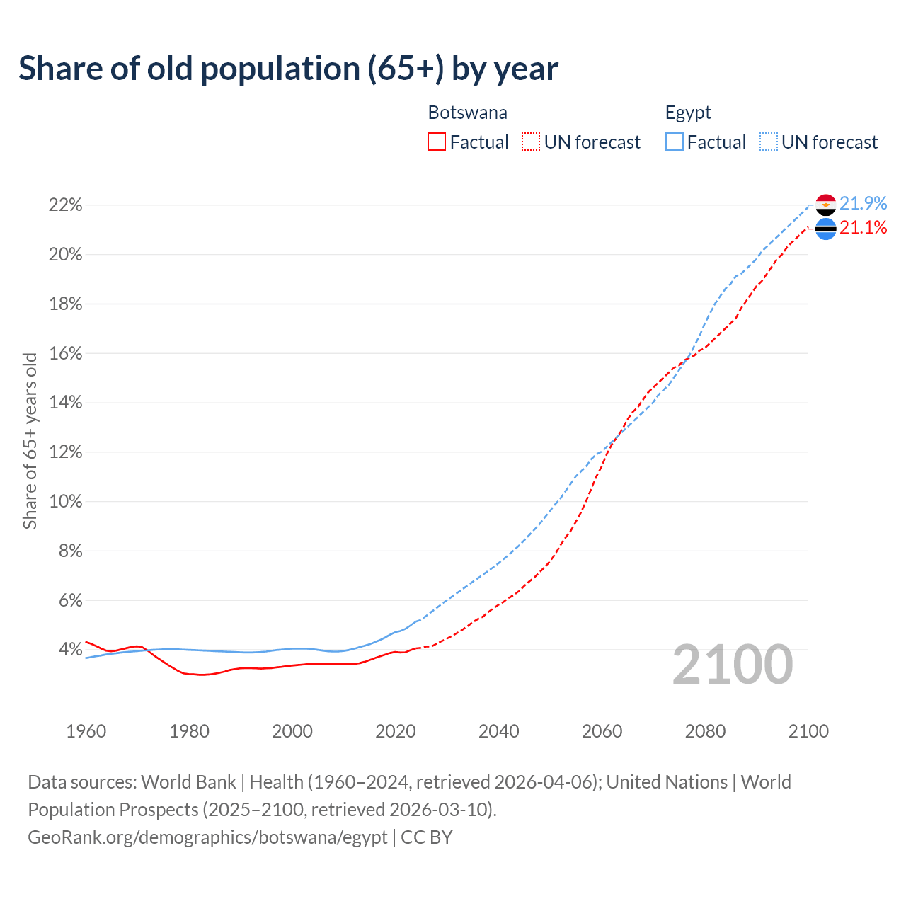 The share of older people aged 65 and over is 4.04% in Botswana and 5.12% in Egypt. Life expectancy in Botswana compared to Egypt .