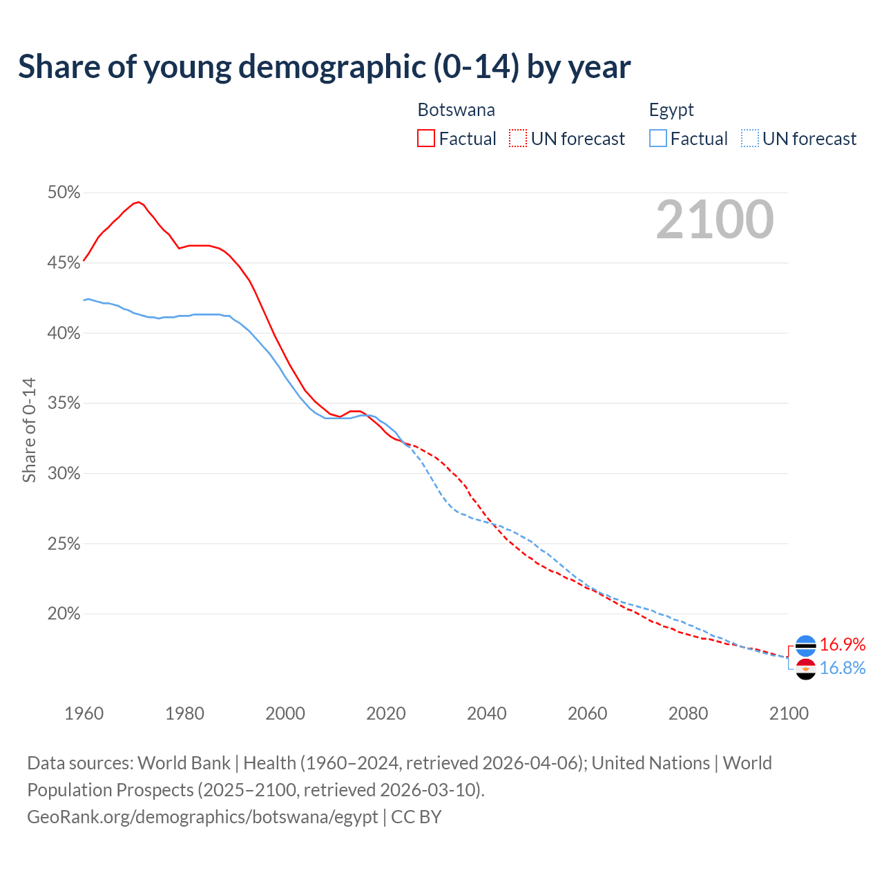- The share of young demographic (0-15 years old) in Botswana is 32.1% vs 32% in Egypt.