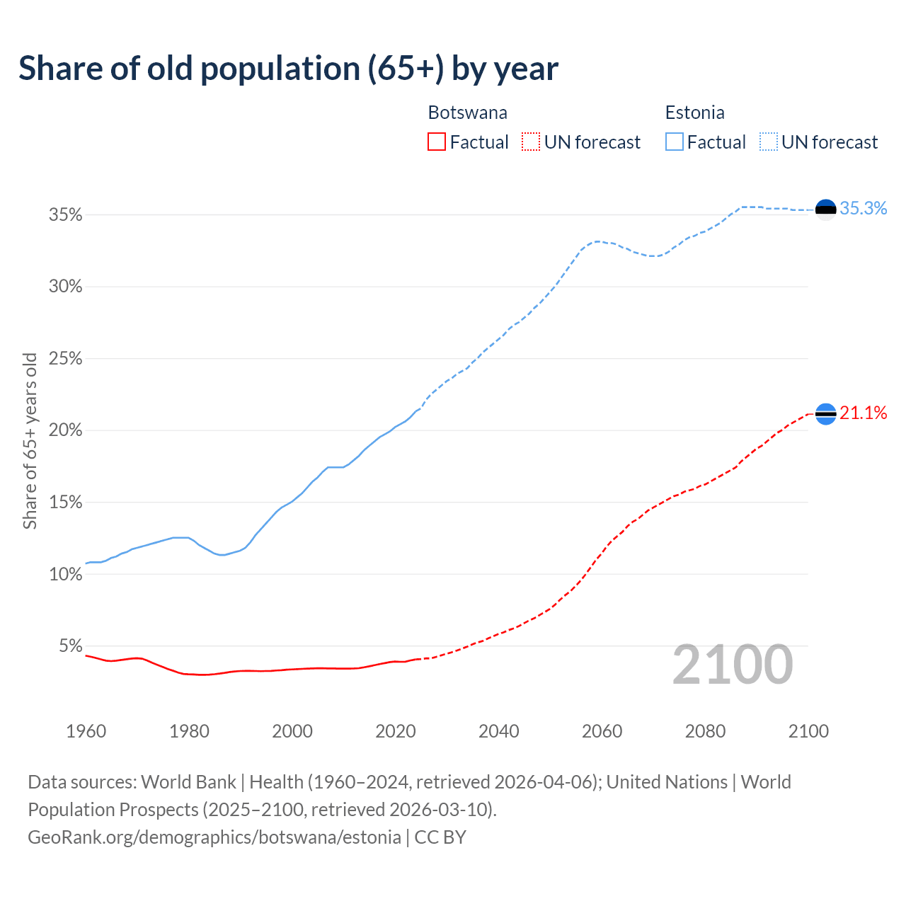 The share of older people aged 65 and over is 4.04% in Botswana and 21.3% in Estonia. Life expectancy in Botswana compared to Estonia .
