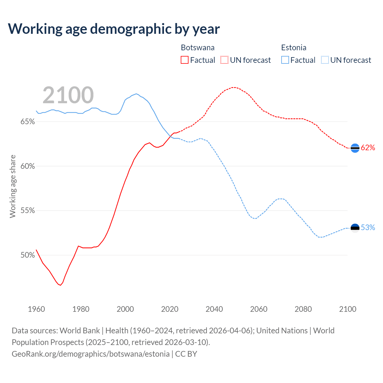 Median age Botswana vs Estonia, 1960-2100