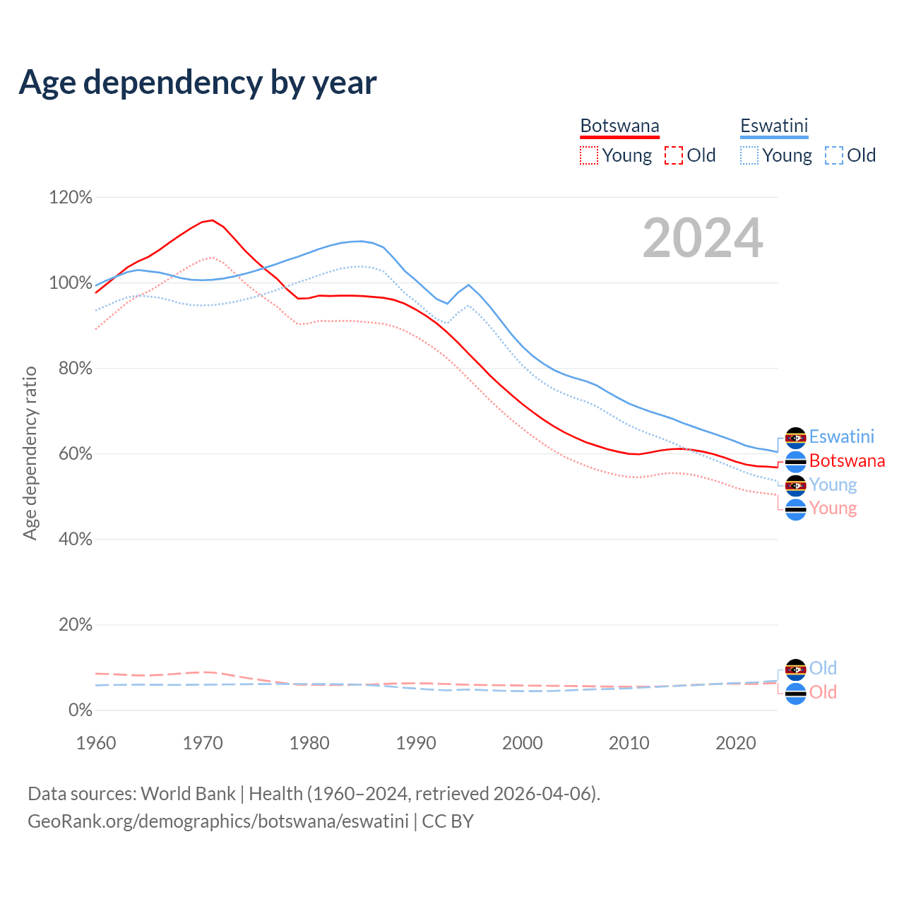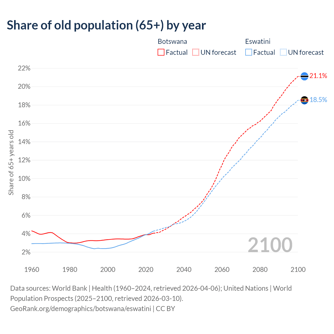 The share of older people aged 65 and over is 4.04% in Botswana and 4.26% in Eswatini. Life expectancy in Botswana compared to Eswatini .