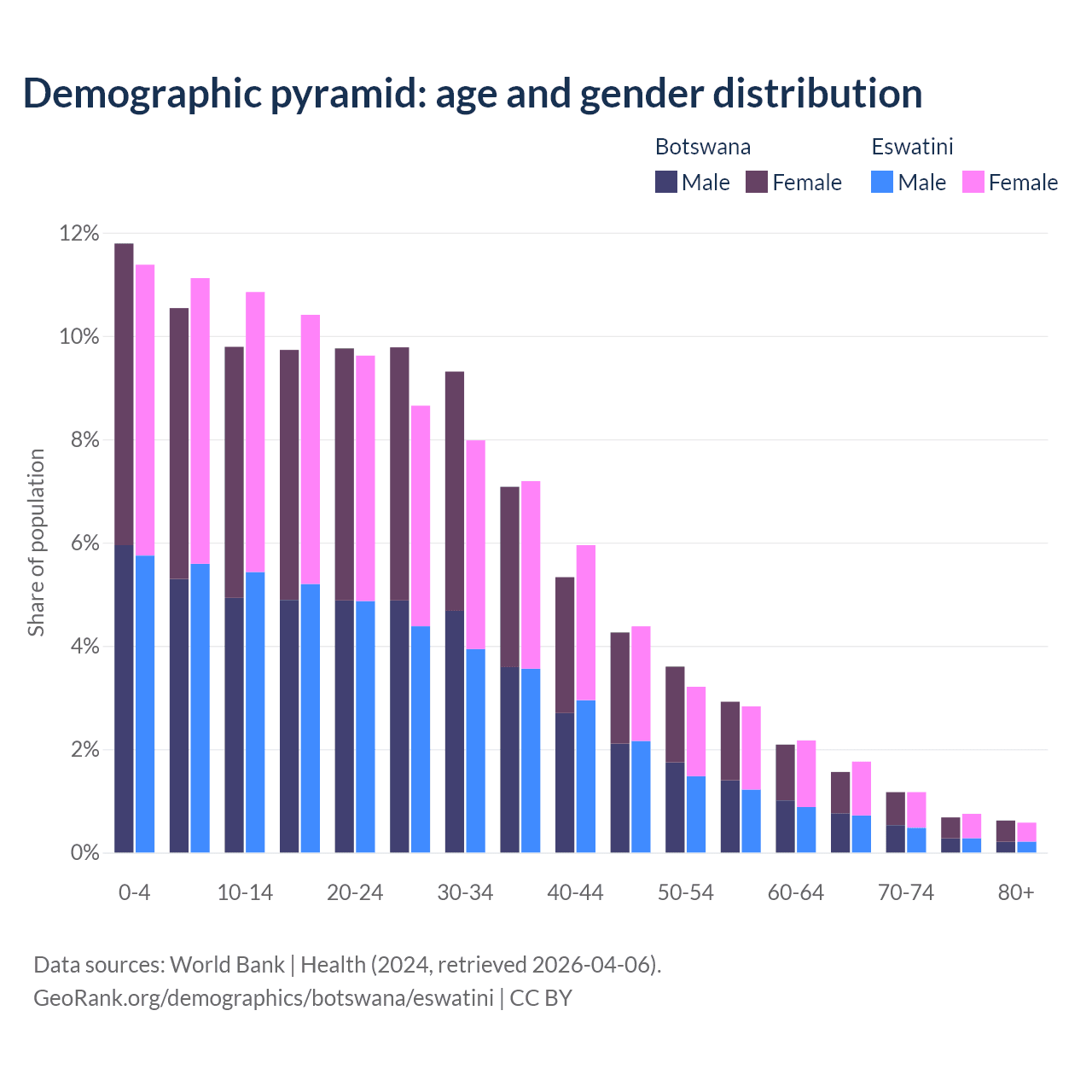 - The median age in Botswana is 24.2 years compared to 23.2 years in Eswatini.