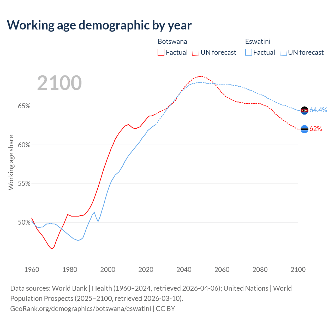 - Botswana has 1.67M working age adults (aged 15-64) vs 794K in Eswatini.