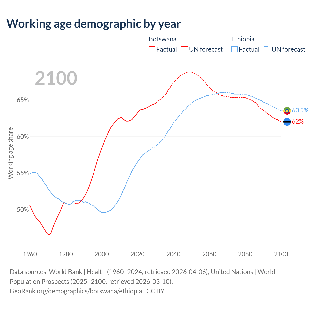 - Botswana has 1.67M working age adults (aged 15-64) vs 80.7M in Ethiopia.