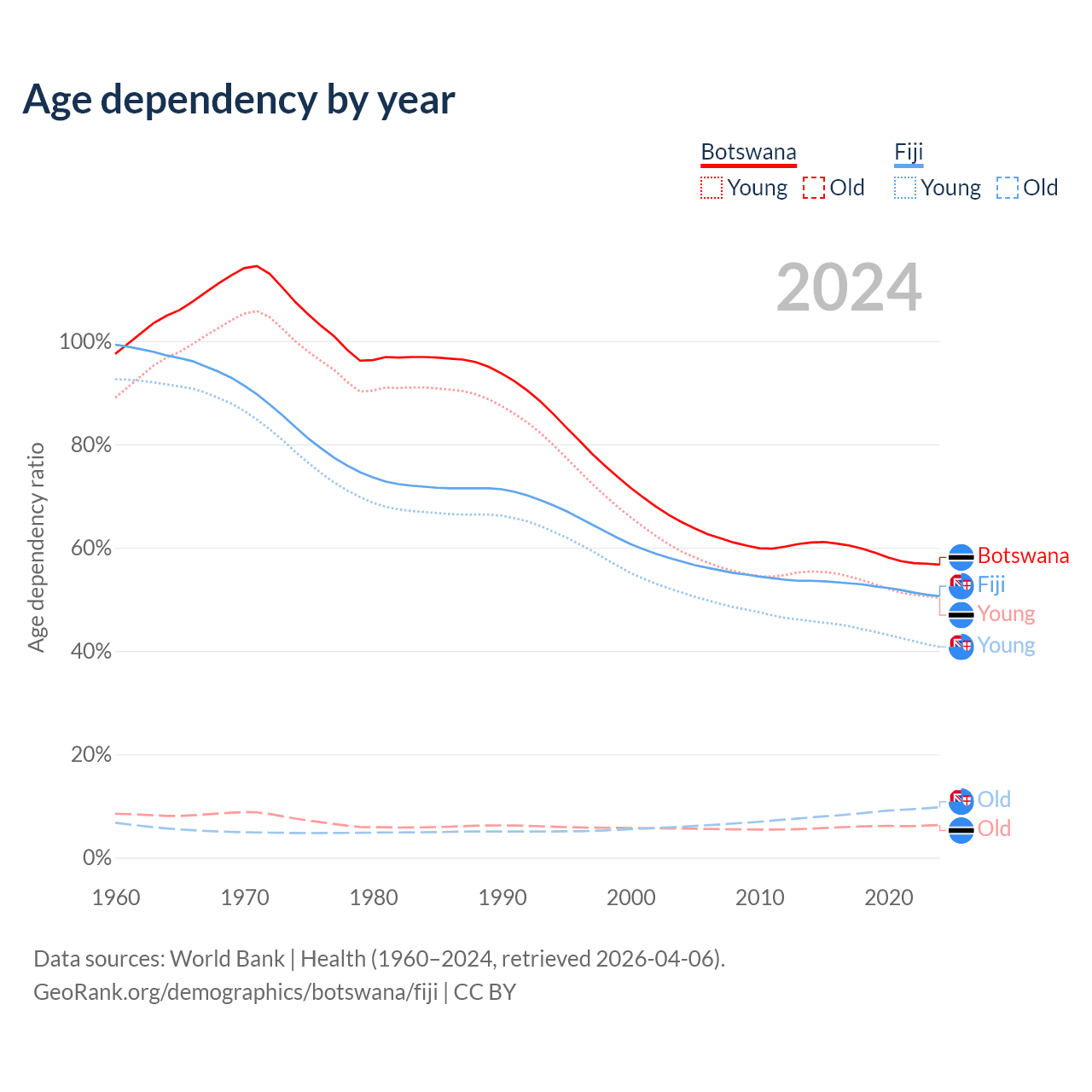 - The share of old-age demographic (65+) in Botswana is 4.04% vs 6.49% in Fiji.