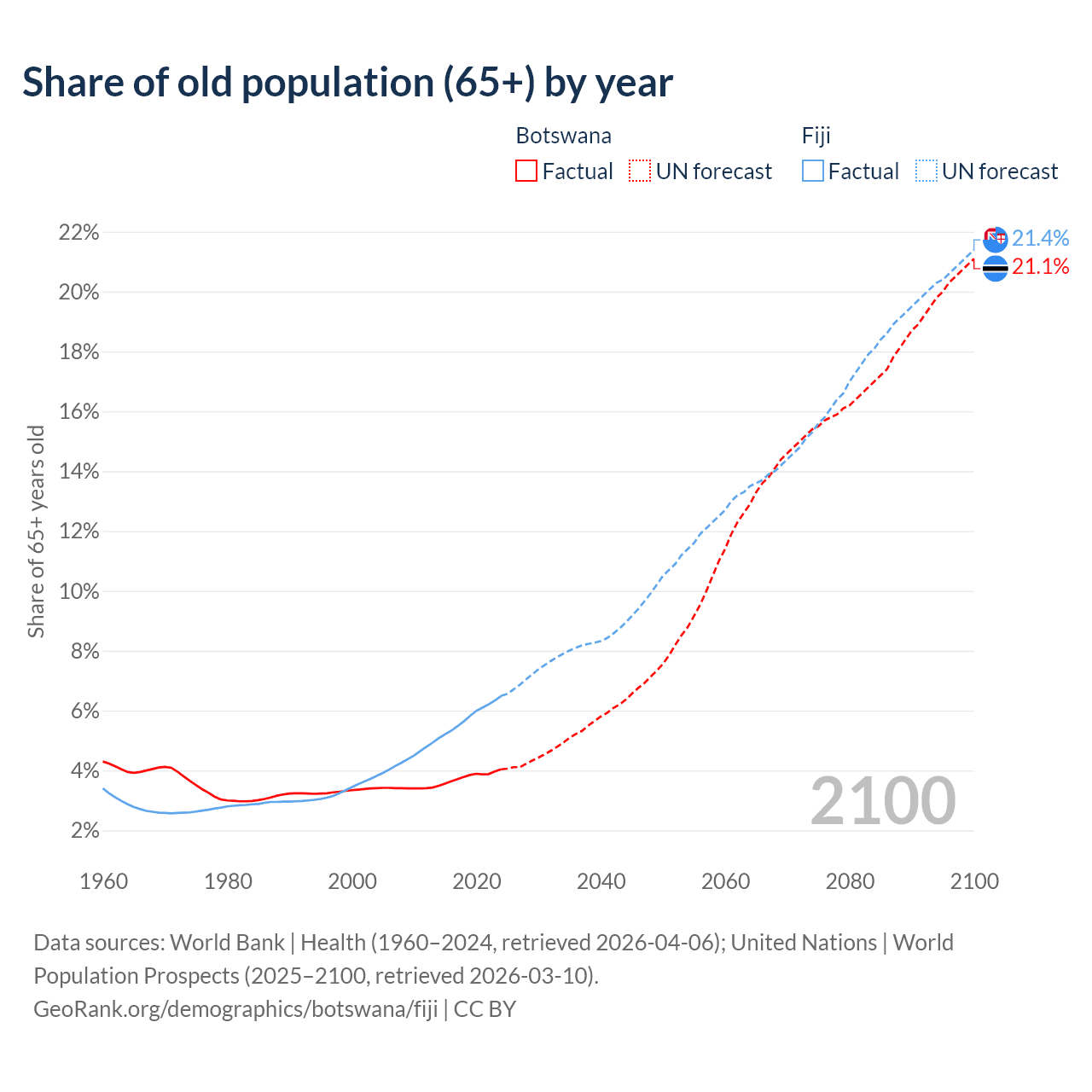 The share of older people aged 65 and over is 4.04% in Botswana and 6.49% in Fiji. Life expectancy in Botswana compared to Fiji .