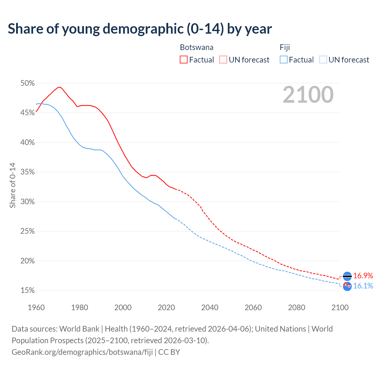 - The share of young demographic (0-15 years old) in Botswana is 32.1% vs 27.1% in Fiji.