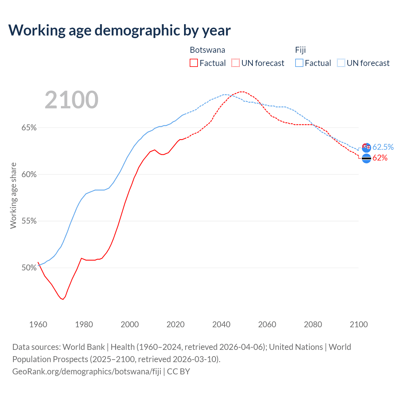 - Botswana has 1.67M working age adults (aged 15-64) vs 623K in Fiji.